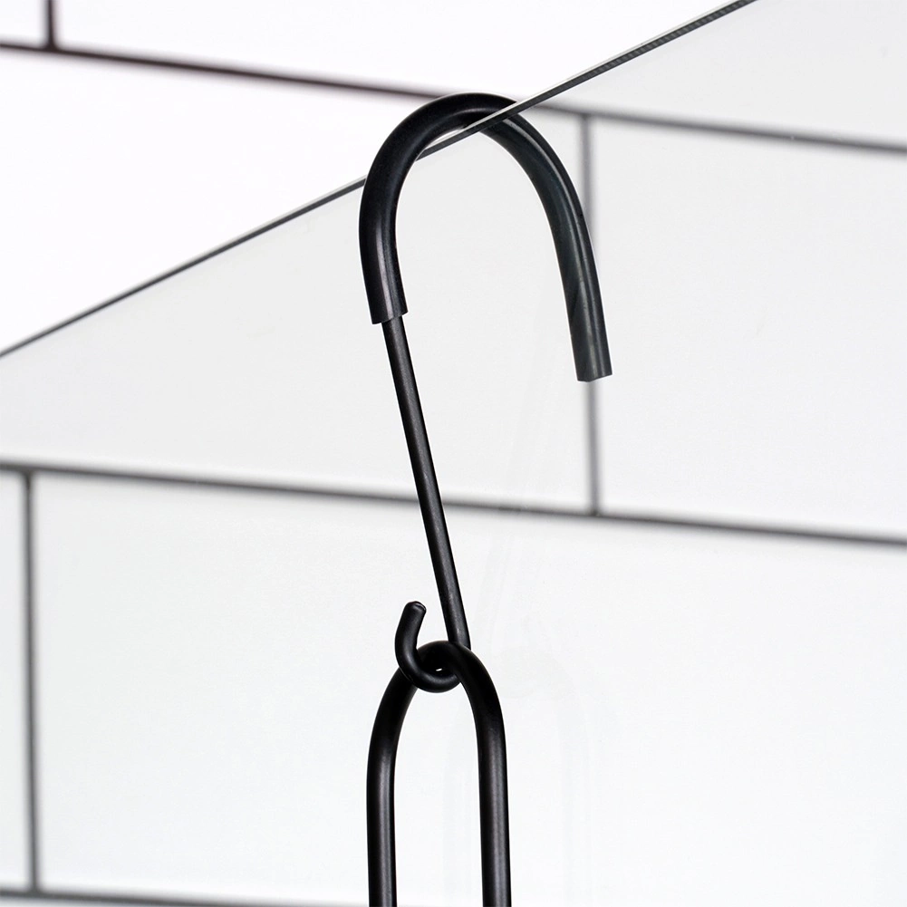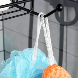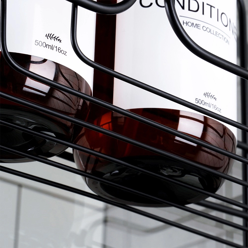 Det kvalitetsmæssige sortlakerede metal er robust og korrosionsbestandigt, så hylden holder til daglig brug. Gummibelægningen på ophængskrogen beskytter glasset og forhindrer at den glider. De to store hylder rummer shampoo og gel, den nederste sæbeskål og det dobbelte sæt kroge er ideelle til svampe, barberblade eller børster.