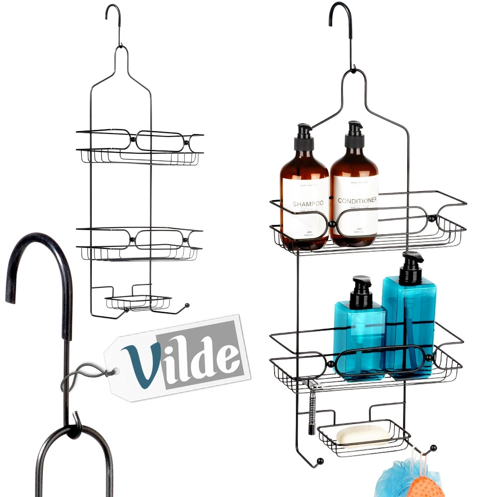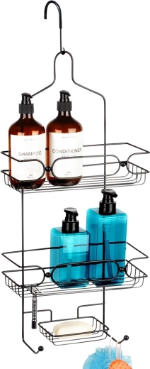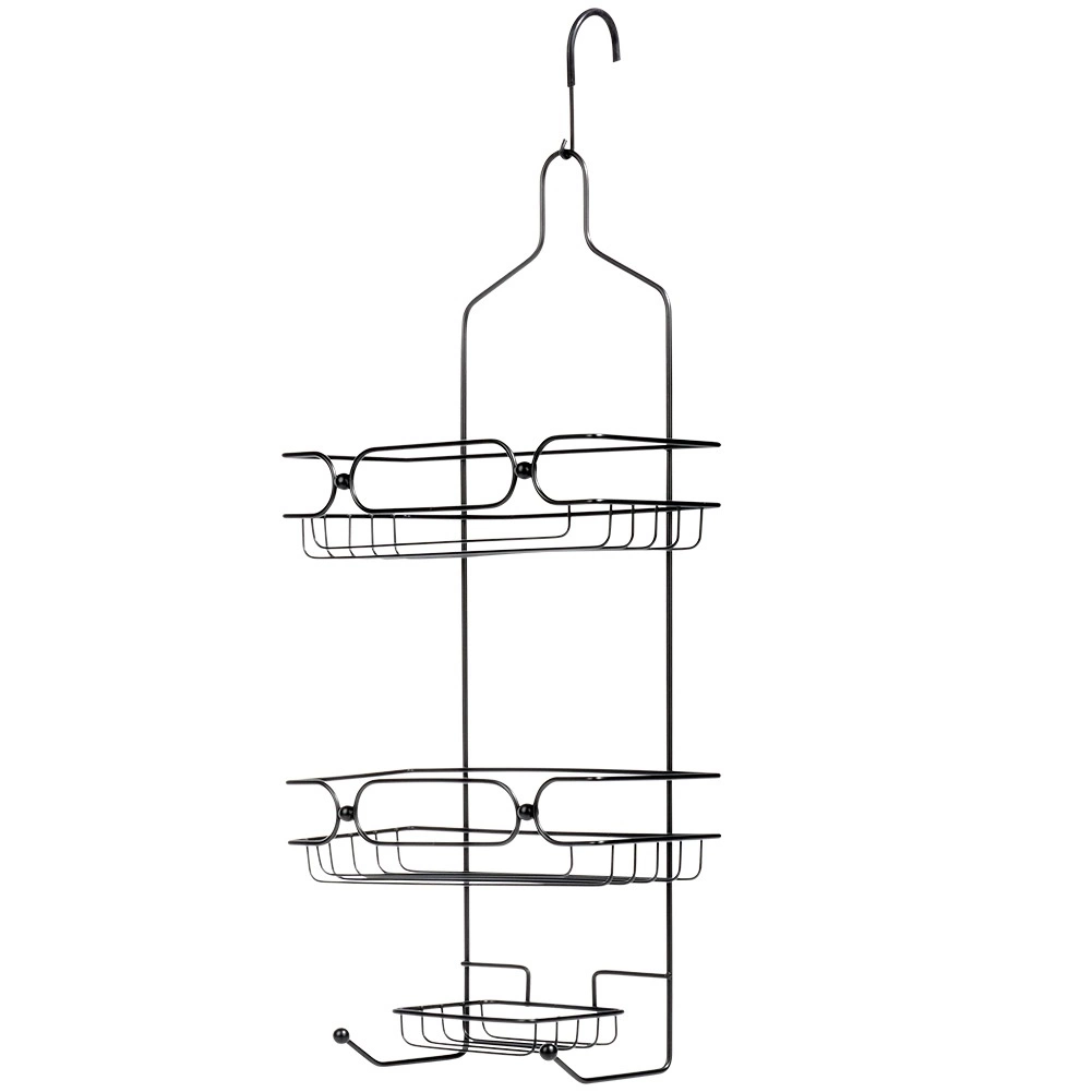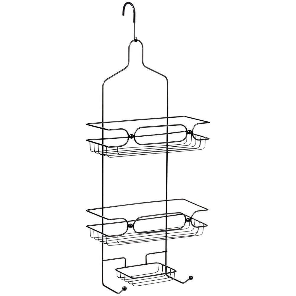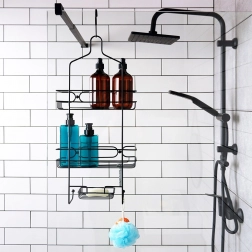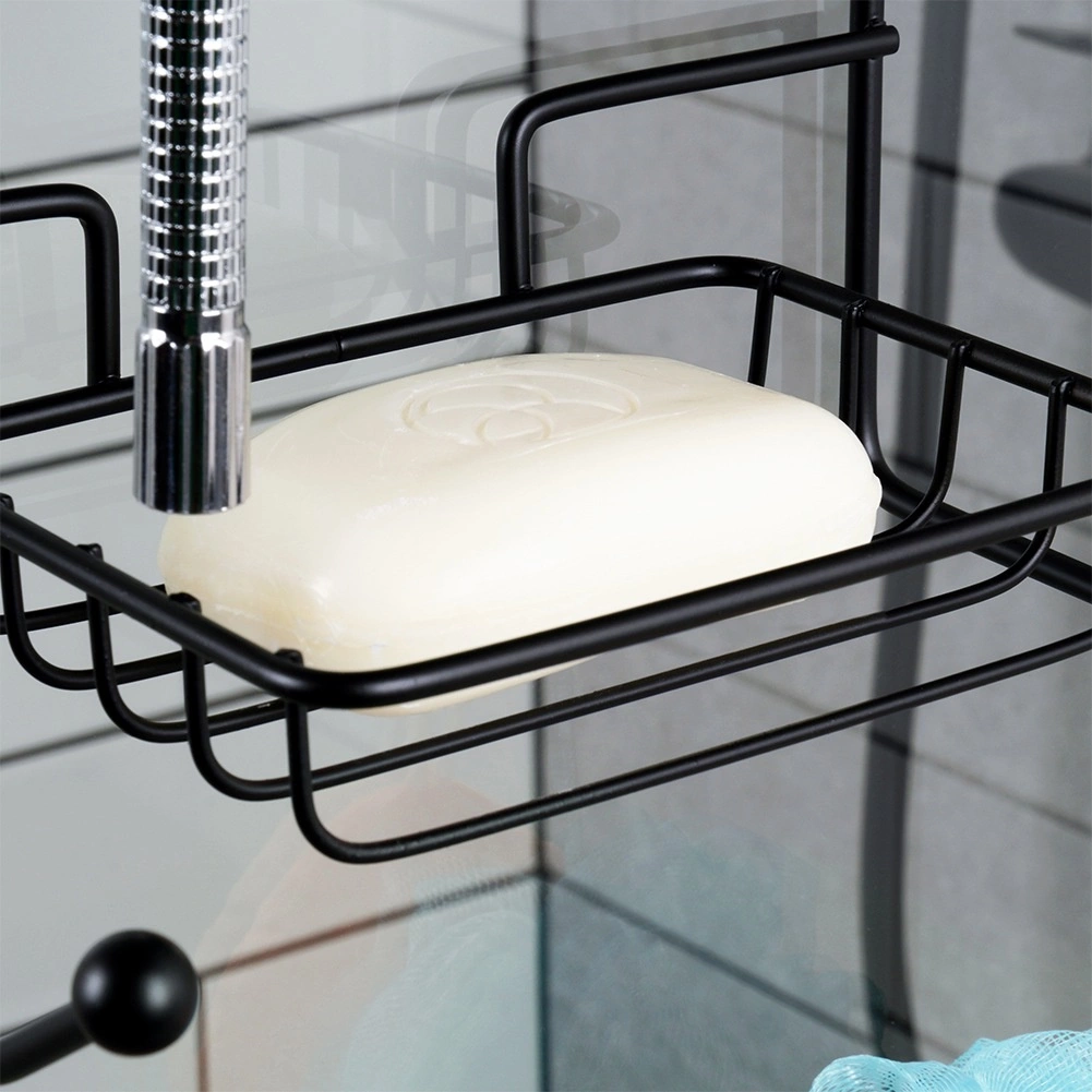 Den praktiske hængende brusehylde i elegant sort holder dit badeværelse overskueligt og stilfuldt. Den tilbyder montering uden boring, holdbar metalkonstruktion med antikorrosionsbehandling og en krog belagt med gummi for sikker ophængning uden at ridse glasset. To rummelige hylder, en sæbeskål og kroge til tilbehør holder alt lige ved hånden.