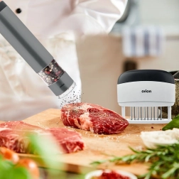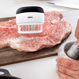 Gør tilberedningen af saftige bøffer, schnitzler og stege nemmere. Denne kød-mørner med 20 nåle i rustfrit stål perforerer muskelfibrene i dybden, forkorter tilberedningstiden, gør strukturen mere mørt og lader marinaden trænge jævnt ind. Resultatet er fyldigere smag og større saftighed.