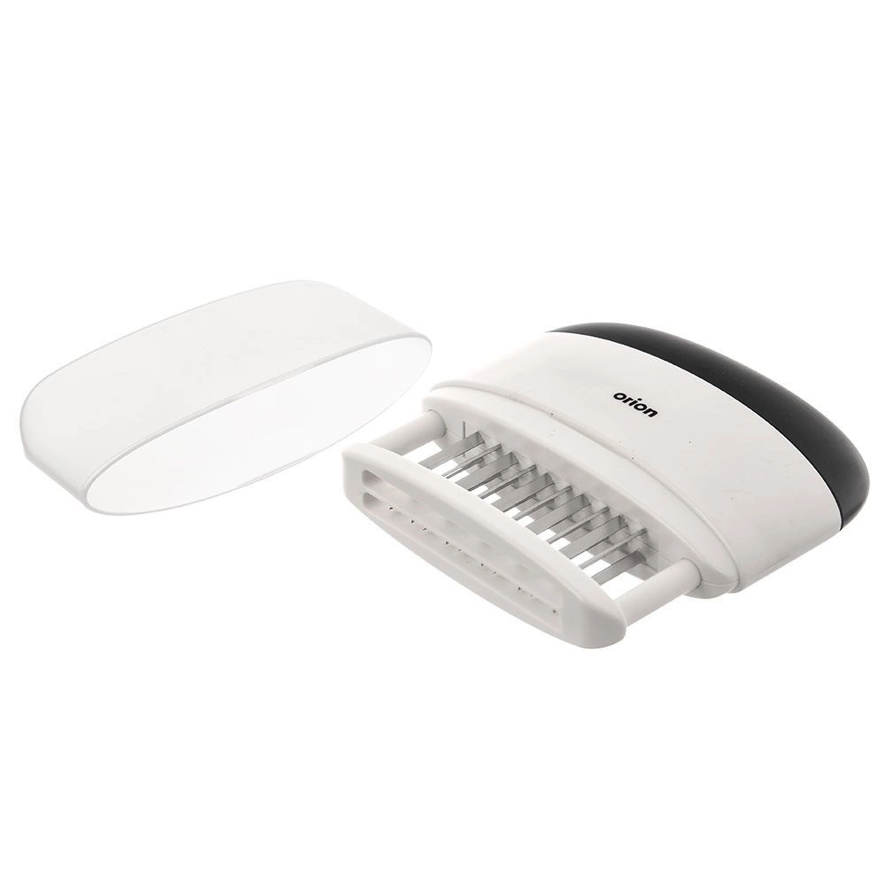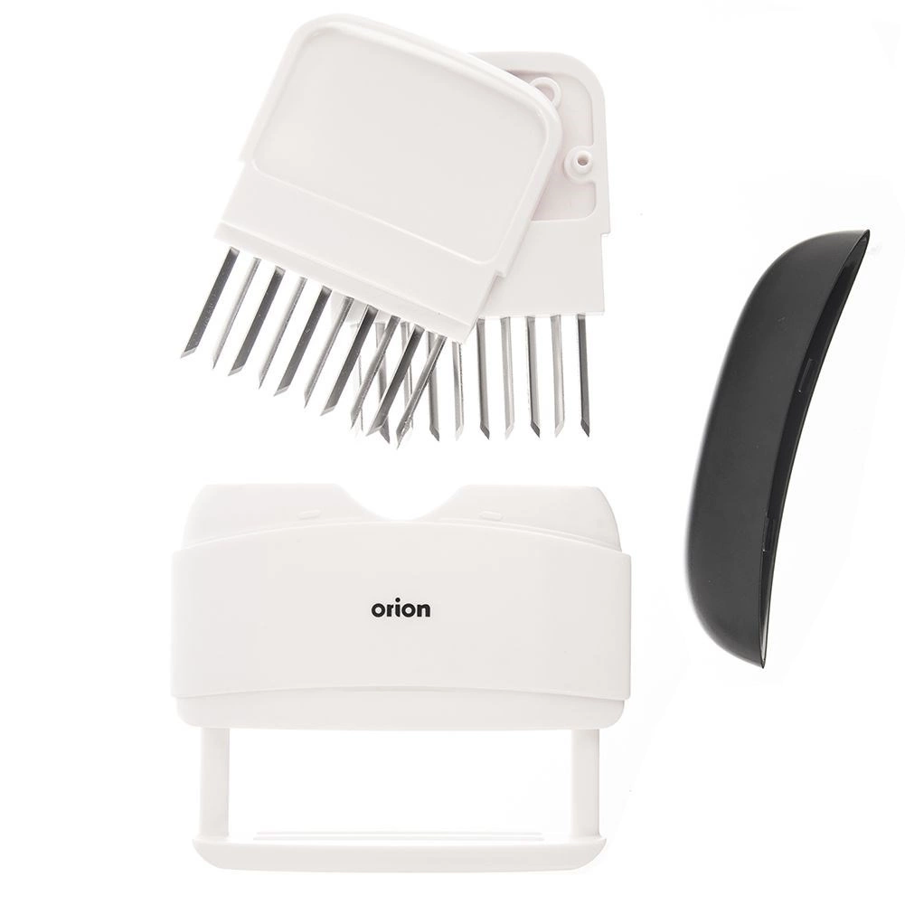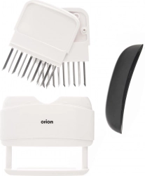 Det kompakte køkkenredskab har et ergonomisk håndtag for et behageligt greb og en aftagelig sikkerhedshætte for sikker opbevaring. Kroppen er af kvalitetsplast, nålene af rustfrit stål godkendt til kontakt med fødevarer. Placér på kødet og tryk ned – hurtigt, rent og effektivt.