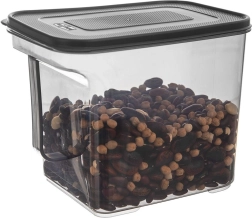 Hold orden i køkkenet med en alsidig beholder til tørvarer med en kapacitet på 2,75 l. Den gennemsigtige krop i mørkegrå farve giver øjeblikkeligt overblik over indholdet uden at åbne, mens det solide låg sikrer fremragende tæthed og beskyttelse mod fugt og lugte. Det praktiske håndtag gør det nemt at håndtere og tage ud af skabet.