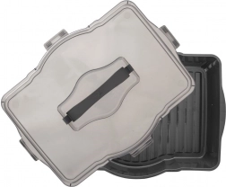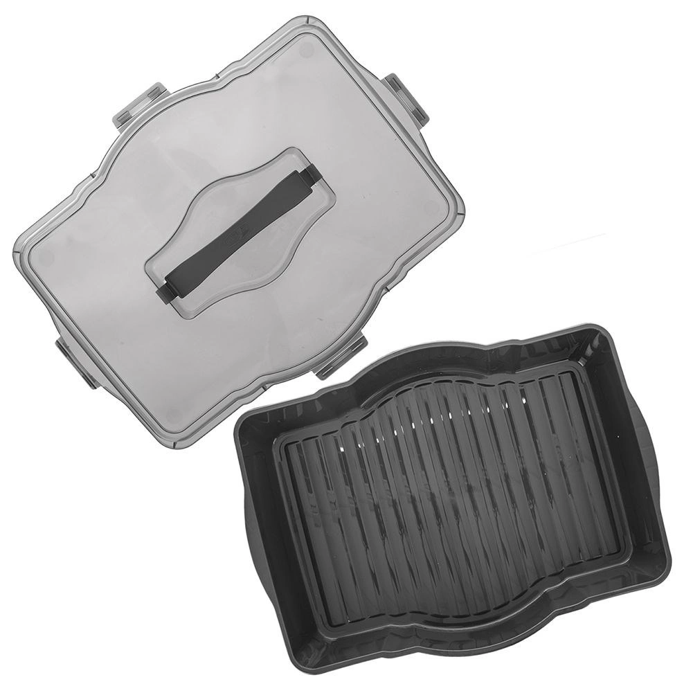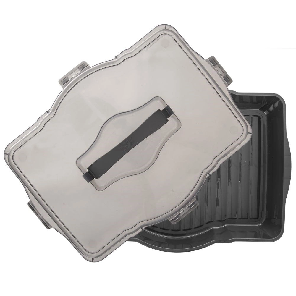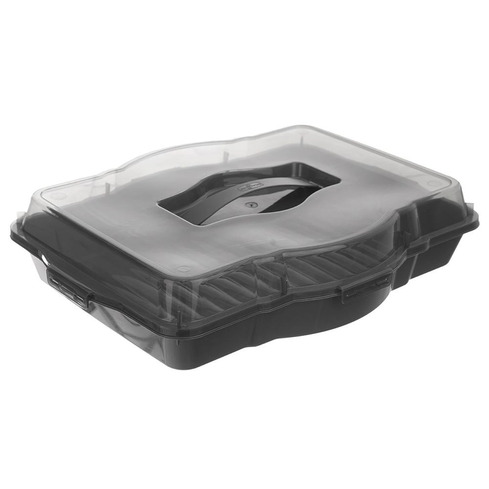 Stor boks til sikker transport og opbevaring af mad derhjemme, på besøg og til havefester. Det gennemsigtige låg med indbygget håndtag gør det let og sikkert at bære, og fire solide klips sikrer tæt lukning og beskyttelse af indholdet mod udtørring og insekter. Den robuste grå udførelse passer i ethvert køkken.
