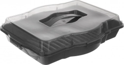Praktisk, rummelig transportboks til mad med 4 låseklips, gennemsigtigt låg med håndtag og robust plastkrop i grå farve. Ideel til kager, desserter, sandwich, oste og pålæg, holder dem friske og beskyttede under transport og servering. Velegnet til køleskab, fryser og til opvarmning i mikrobølgeovn uden låg, kan vaskes i opvaskemaskine.