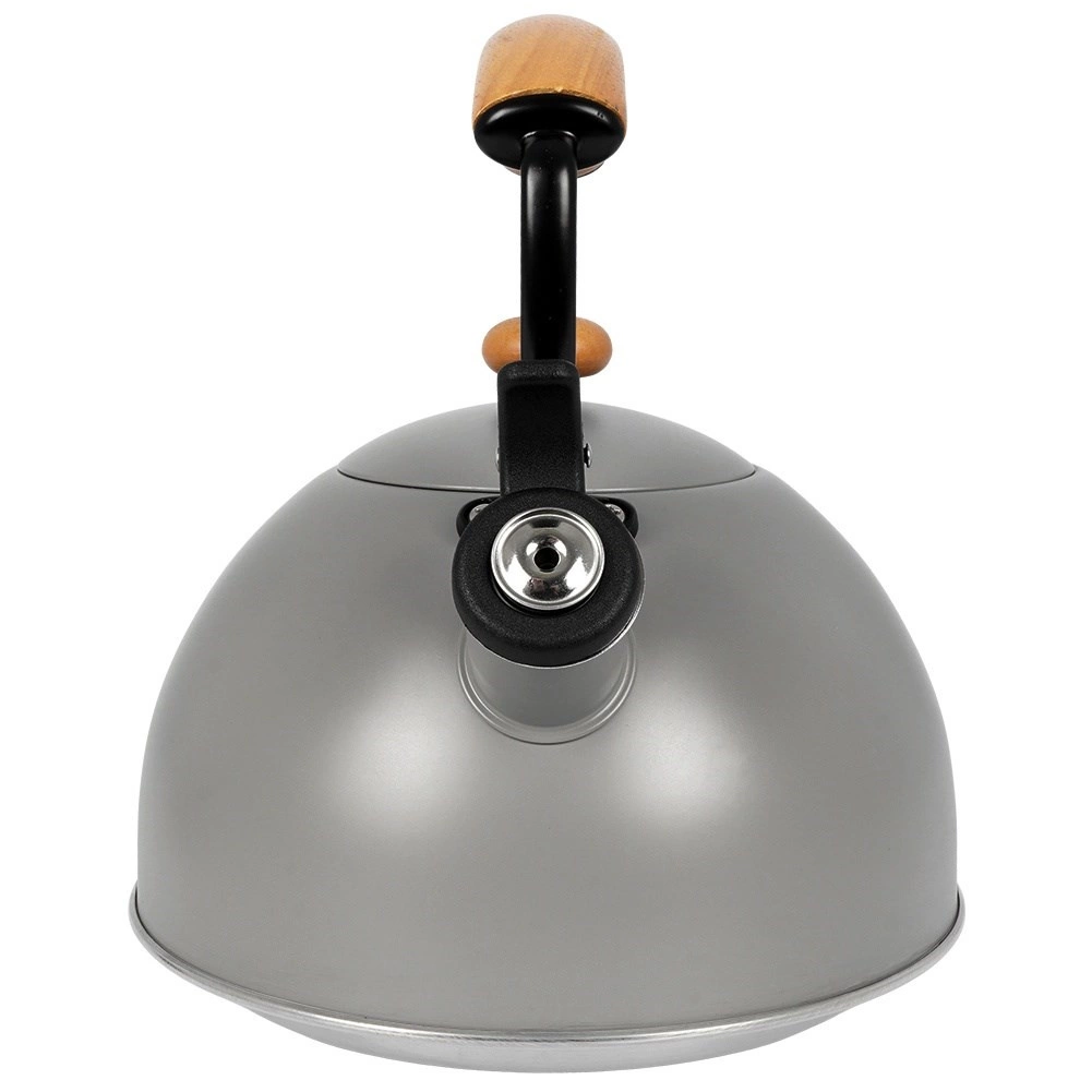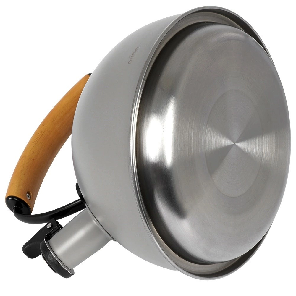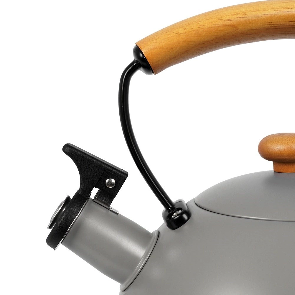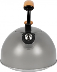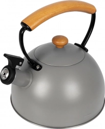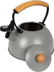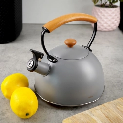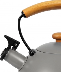 En luksuriøs kedel af rustfrit stål i grå med trædetaljer af gummitræ er ideel til hurtigt at bringe vand i kog til kaffe, te og urter. Takket være det ergonomiske træhåndtag og den nedfældelige fløjte er håndteringen sikker og komfortabel. Kedlen er energibesparende, og rustfrit stål påvirker ikke vandets smag.