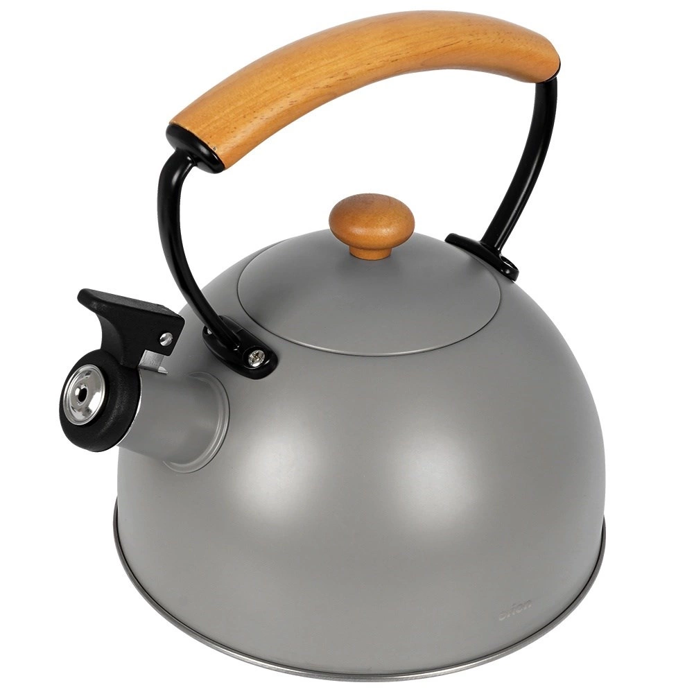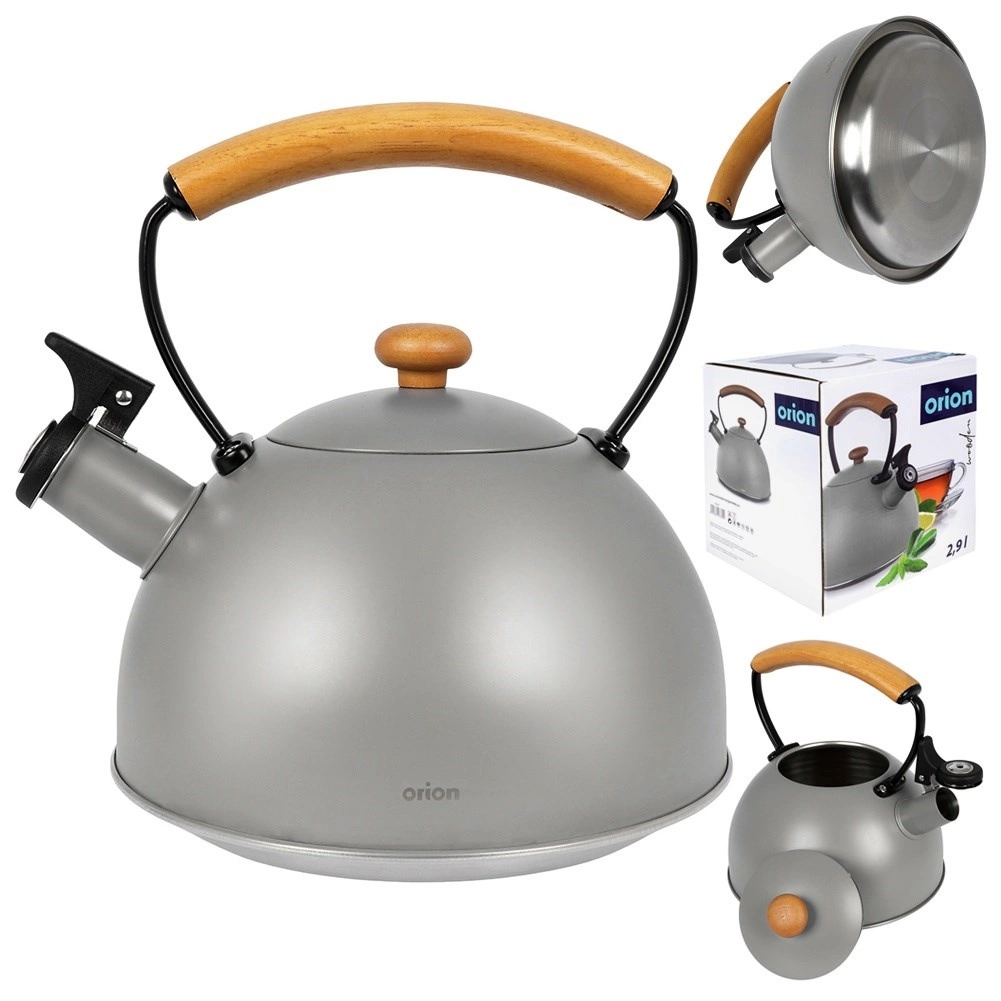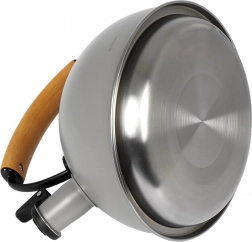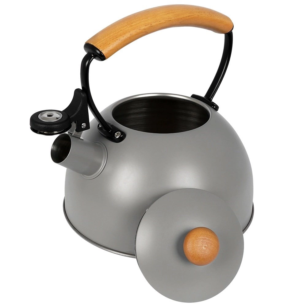 En luksuriøs kedel af rustfrit stål i grå med trædetaljer af gummitræ er ideel til hurtigt at bringe vand i kog til kaffe, te og urter. Takket være det ergonomiske træhåndtag og den nedfældelige fløjte er håndteringen sikker og komfortabel. Kedlen er energibesparende, og rustfrit stål påvirker ikke vandets smag.