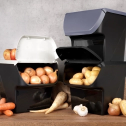 Hold orden i køkkenet og viktualierummet. Denne antracitfarvede boks med vippelåg er ideel til opbevaring af kartofler, løg, hvidløg, frugt og grøntsager. Frontadgangen gør det nemt at tage indhold ud uden at afstable, så du altid har alt lige ved hånden.