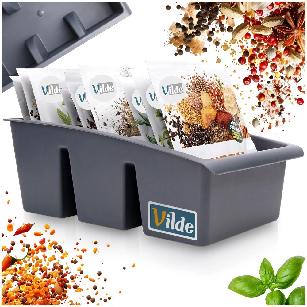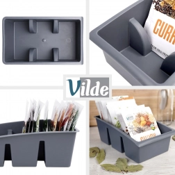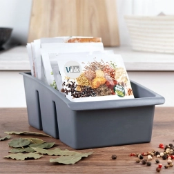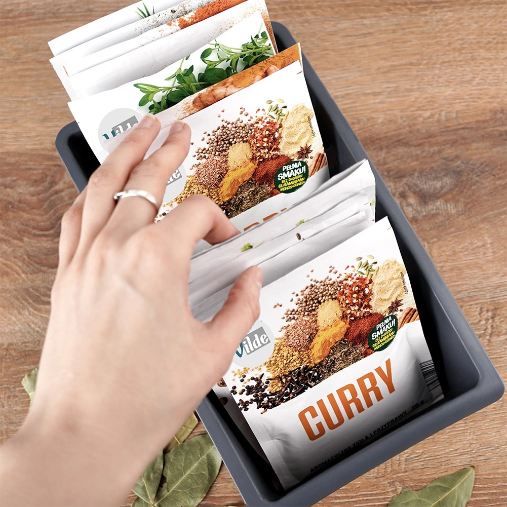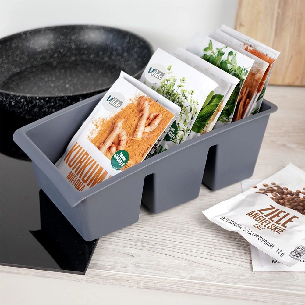 Den praktiske køkkenorganizer holder krydderi- og urteposer stående, overskuelige og altid ved hånden. Med to indvendige skillevægge er den opdelt i tre dele, så du nemt kan sortere krydderier efter type eller anvendelse. Den lave forkant sikrer god synlighed og hurtig udtagning af den rigtige pose.