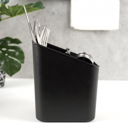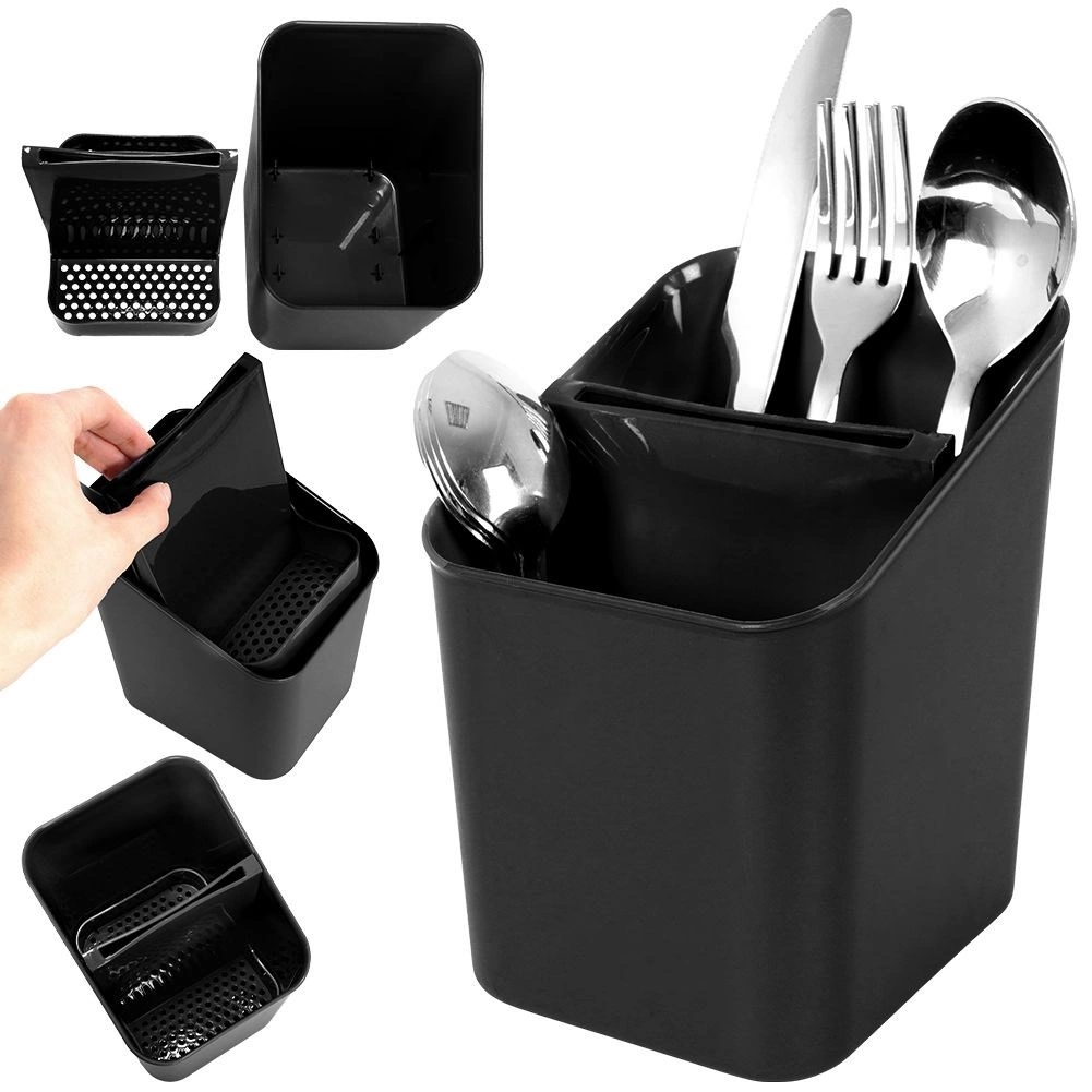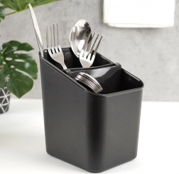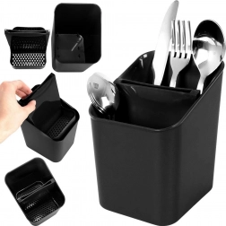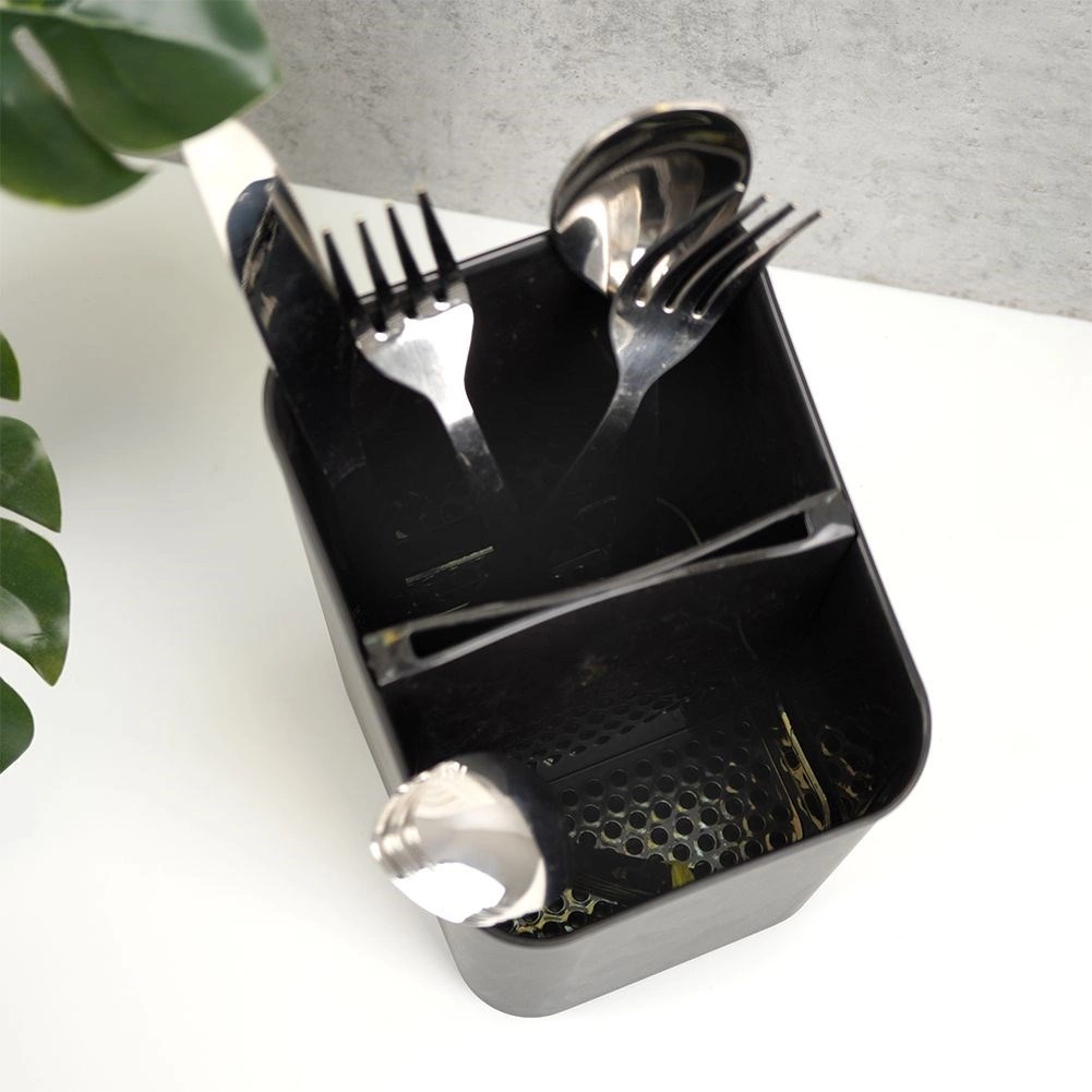 Elegant og funktionel bestikafdrypper i tidløs sort holder dit køkken organiseret og rent. Med den aftagelige separator opdeler du nemt bestikket, og når den fjernes, får du en rummelig beholder med ét kammer. Den perforerede bund muliggør hurtig afvanding, så bestikket ikke står i fugt, og bordpladen forbliver tør.