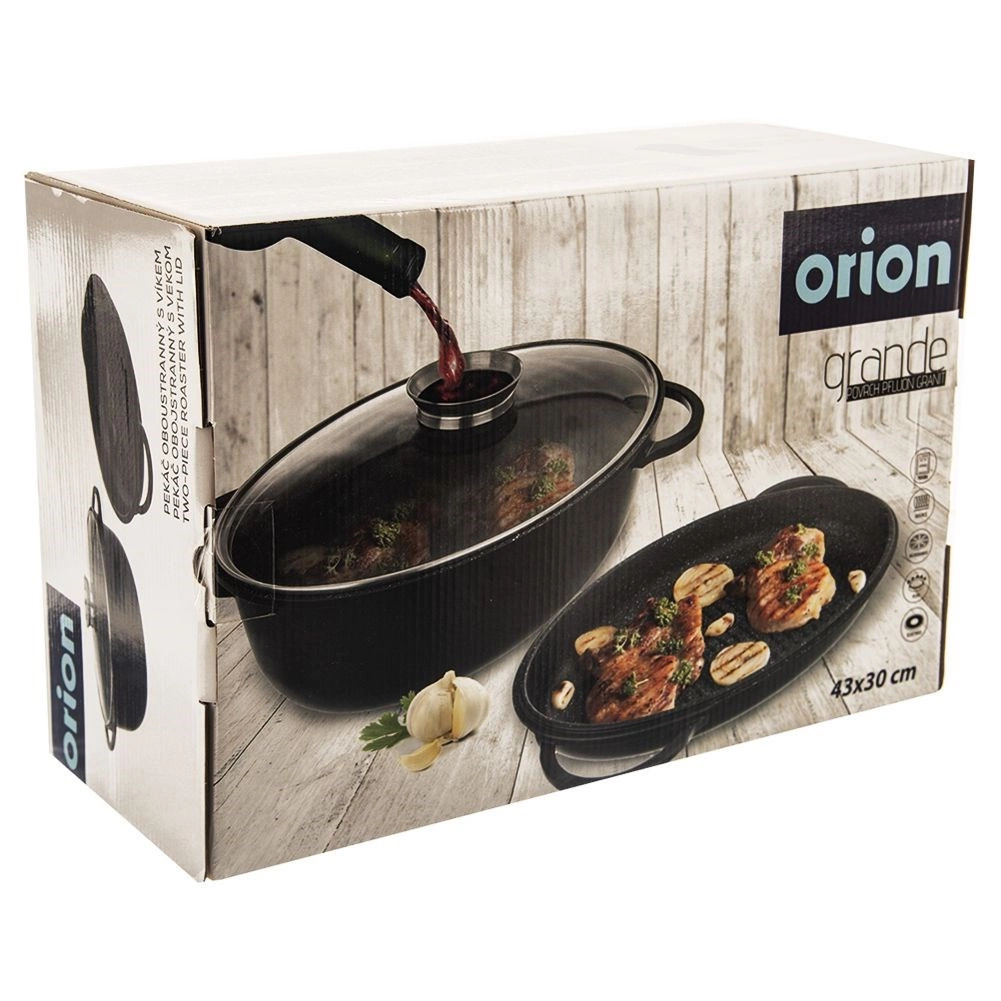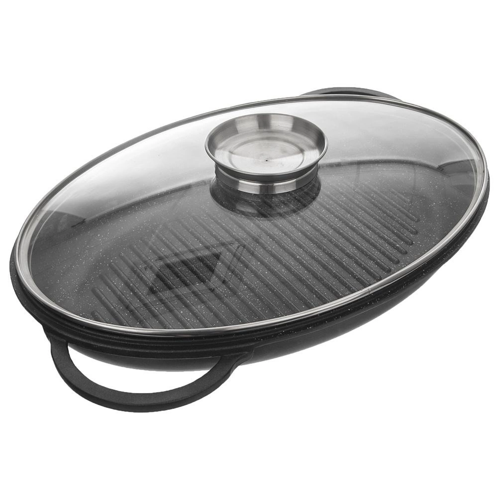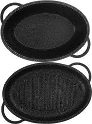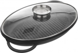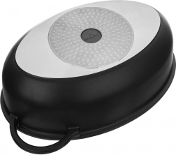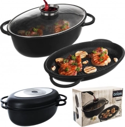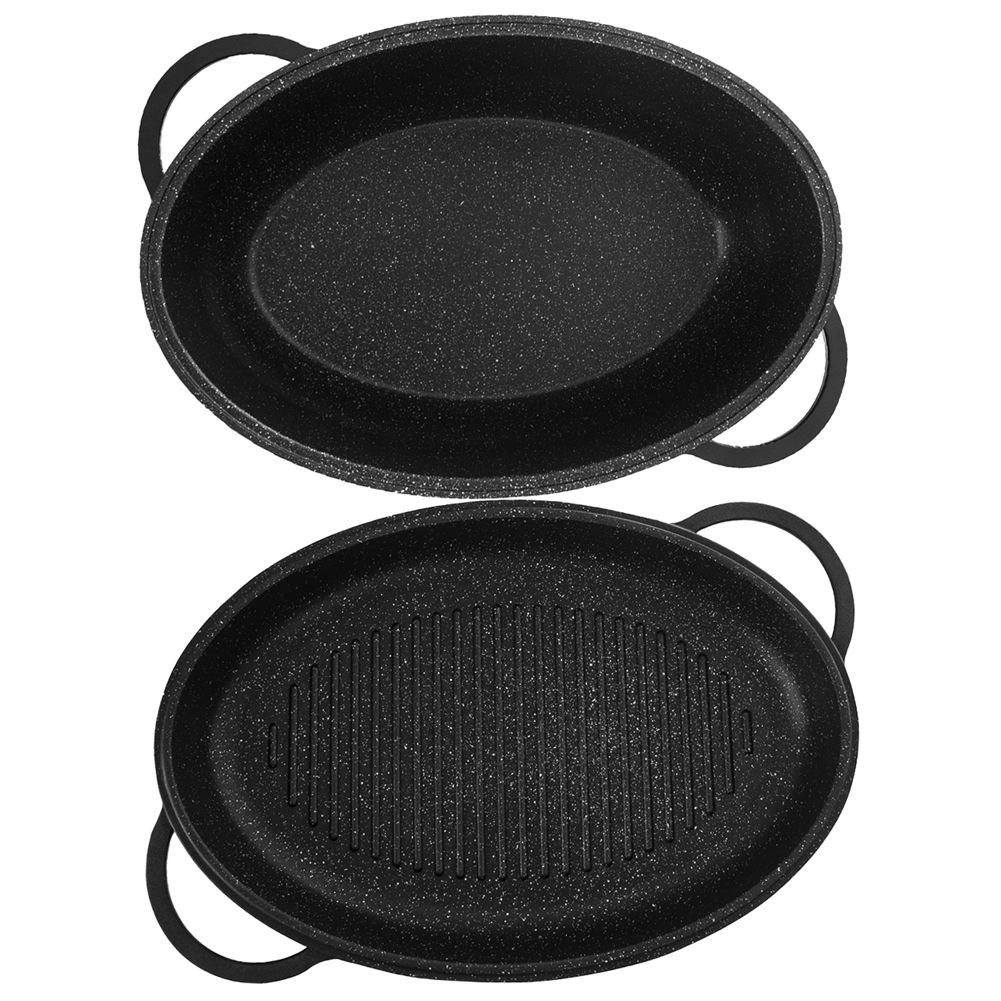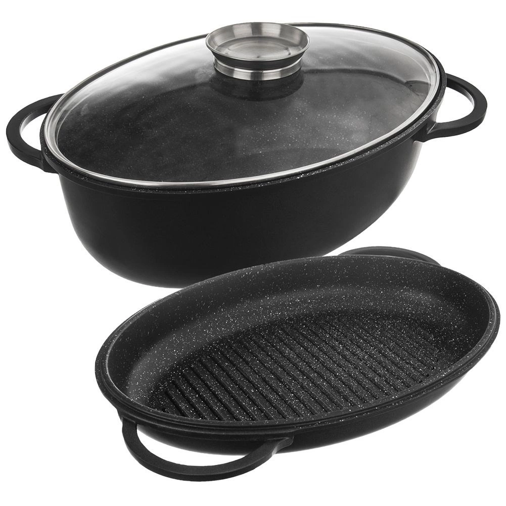 Dette gennemtænkte sæt kombinerer en dyb oval bradepande med en kapacitet på 10 l, en grillpande, der også kan bruges som låg, samt et separat varmebestandigt glaslåg med doseringsenhed. Den robuste konstruktion i støbt aluminium akkumulerer varme effektivt, og den granitbaserede nonstick-belægning PFLUON GRANIT sikrer, at retterne ikke brænder på, og at du kan lave mad med et minimum af olie.