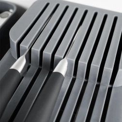 Organisatoren rummer op til 18 knive i forskellige længder – fra små urteknive til længere kokkeknive. Hver kniv har sin egen føring, som beskytter klingen mod at blive sløv og sikrer sikker udtagning. Materialet er nemt at vedligeholde – tør blot af eller skyl.