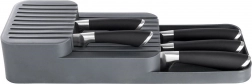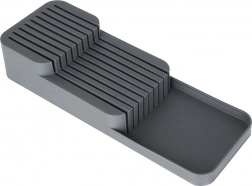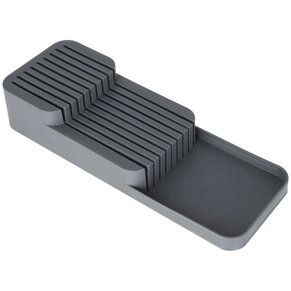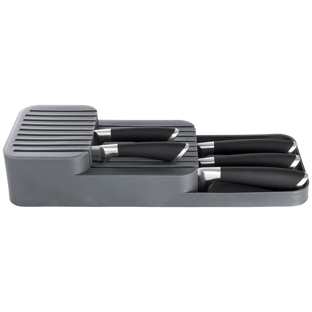 Denne praktiske knivorganisator i robust plast holder dit køkkenudstyr overskueligt og sikkert. Takket være den gennemtænkte konstruktion opbevares knive på to niveauer, så de fylder minimalt og samtidig er lette at nå. Den grå farve og det rene design passer perfekt ind i ethvert moderne køkken.