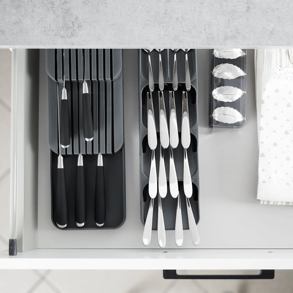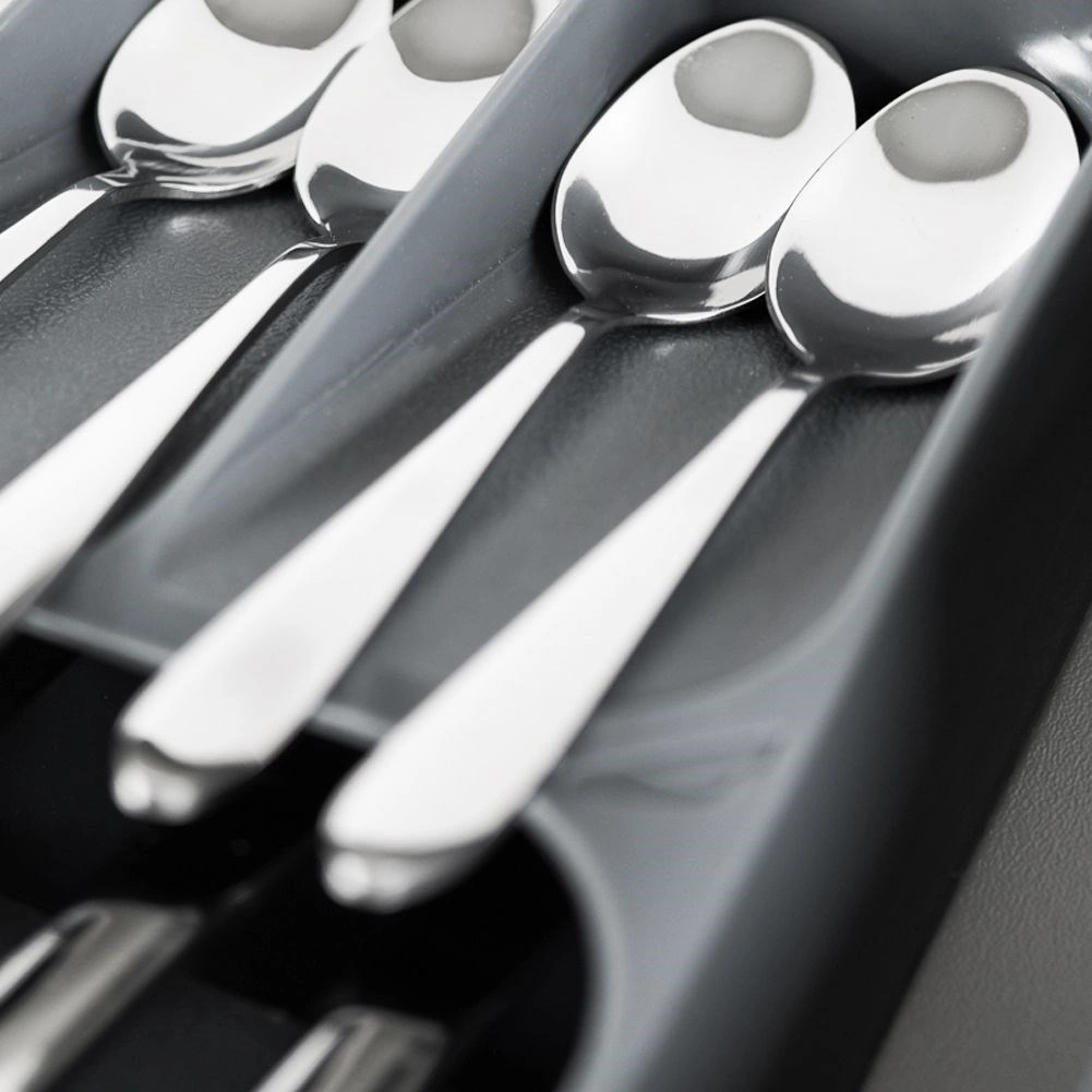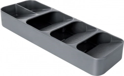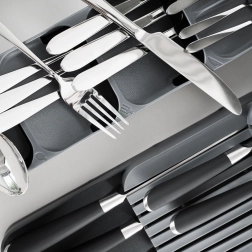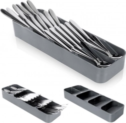 Det holdbare design i kvalitetsplast i elegant grå sikrer nem rengøring og lang levetid. Organizeren er ideel til opbevaring af skeer, gafler, knive samt små skeer og gafler, så hver del har sin plads.
