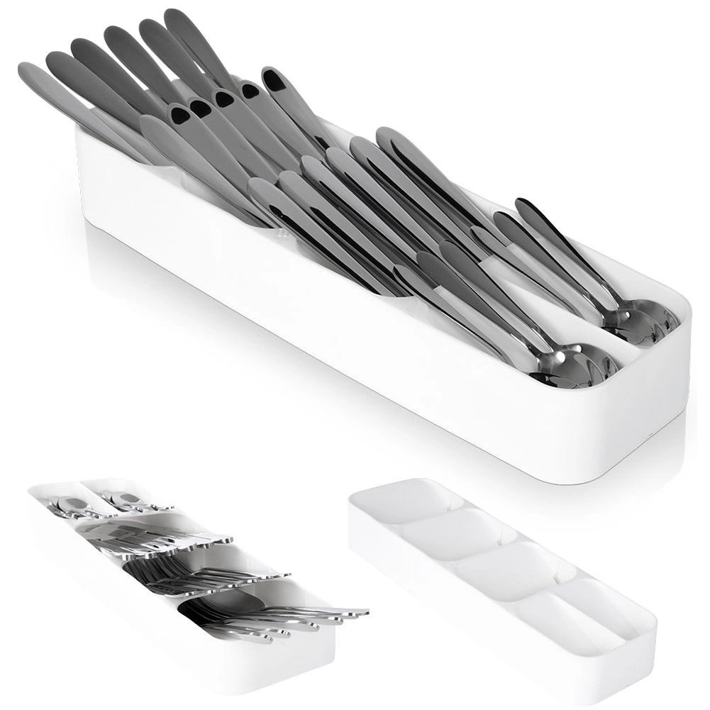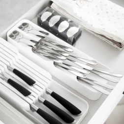 Adskilte sektioner til skeer, gafler, knive og teskeer holder skuffen perfekt organiseret.