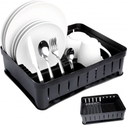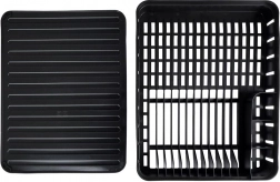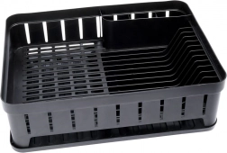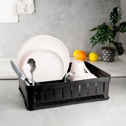 Det elegante og kompakte opvaskestativ er en uundværlig hjælper i ethvert køkken. Det minimalistiske design og det universelle sorte look passer perfekt til klassiske, moderne og industrielle interiører. Den kvalitetsrige plastkonstruktion sikrer styrke og lang levetid, mens den aftagelige gummibakke opsamler vanddråber og holder arbejdsfladen tør.