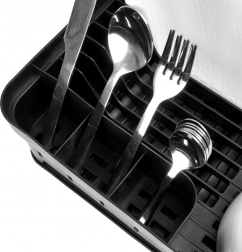 Den gennemtænkte inddeling giver plads til tallerkener, krus og bestik. Tre adskilte sektioner til bestik fremmer tørring og organisering, tallerkenrillerne holder servicen stabilt i lodret position, og afløbsbakken er let at tage ud og rengøre. Opvaskestativet er ideelt til daglig brug og passer, takket være de kompakte mål, også på mindre køkkenborde.