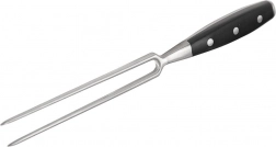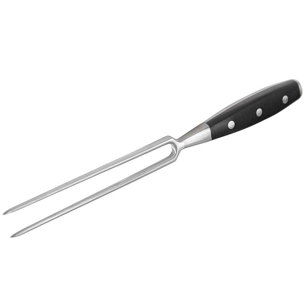Den robuste kødgaffel i rustfrit stål giver præcis kontrol ved udskæring af stege, bøffer og fjerkræ. De lange, skarpe spidser holder kødstykkerne sikkert og gør portionering og servering nem. Det ergonomiske håndtag i slidstærk sort ABS glider ikke i hånden, og takket være 3-punkts nitning opnås maksimal stabilitet.