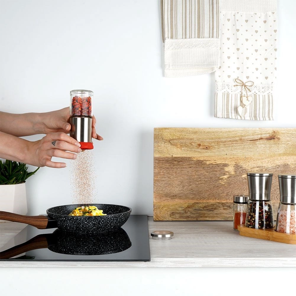 Det gennemsigtige glas gør det let at kontrollere mængde og type krydderi og giver et elegant udtryk på køkkenbordet.