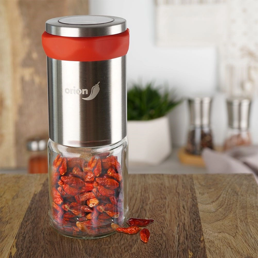 Stilfuld manuel kværn til chili, peber og urter til friskkværnede krydderier lige før servering. Kombinerer en glaskrukke med en holdbar mekanisme i rustfrit stål for fin og effektiv skæring af tørrede chilier uden at knuse dem. Det ergonomiske design med skridsikkert greb ligger godt i hånden, og det elegante udseende pynter i ethvert køkken. Inkluderer beskyttelseslåg mod fugt for længere friskhed.