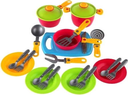 Dette farverige sæt service med skærebræt er perfekt til legekøkkener og rolleleg med madlavning. Den lette, men robuste plast sikrer sikker og langvarig brug, og de enkelte dele ligger godt i små hænder.