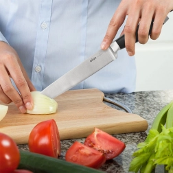 20 cm blad af kvalitets rustfrit stål skærer jævnt og bevarer skarpheden ved korrekt pleje. Ideel til kød, grøntsager og frugt.