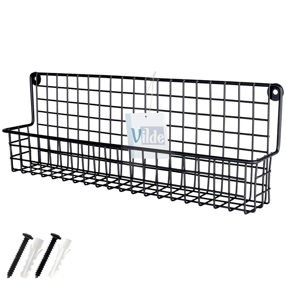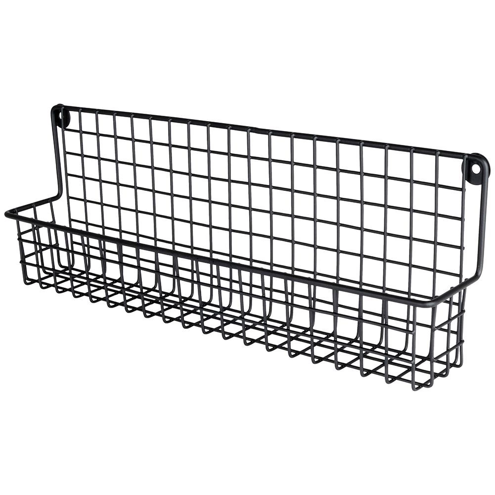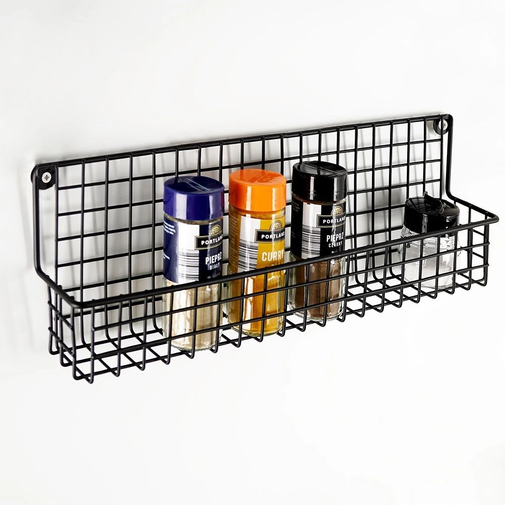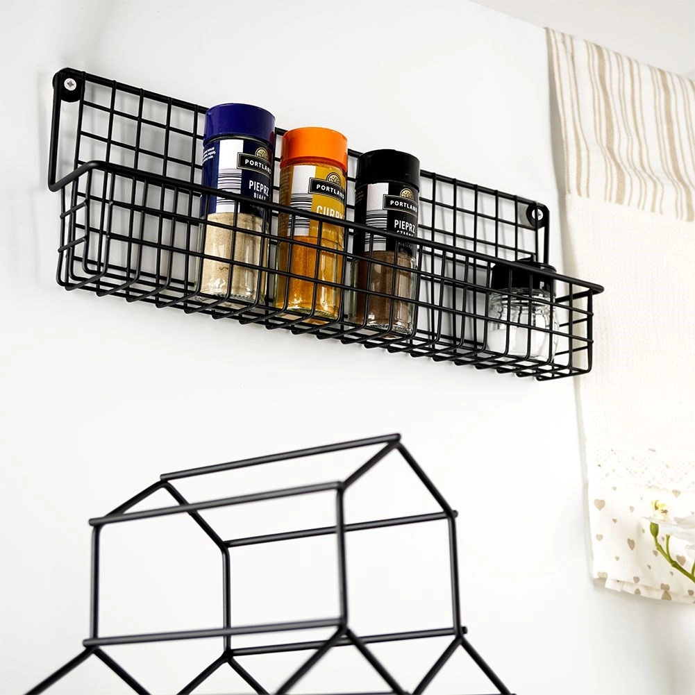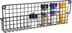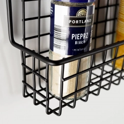 Holdbart sort metal med trådkurv holder krydderiglas og små flasker sikkert på plads og gør det nemt at opbevare dem overskueligt.