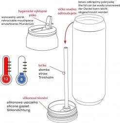 En stilfuld termokop i dåseform med en kapacitet på 500 ml holder dine drikke ved den ideelle temperatur hele dagen. Takket være vakuumisoleret dobbeltvæg er den egnet til varme og kolde drikke, har et hus af rustfrit stål, et tæt låg med vippe-tud og et praktisk sugerør til at drikke uden at vippe. Det moderne design med farverige dinosaurer på mørk baggrund gør den til et fremragende tilbehør til både rejser og arbejde.