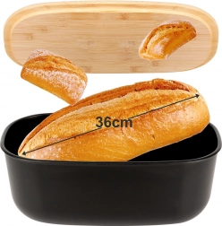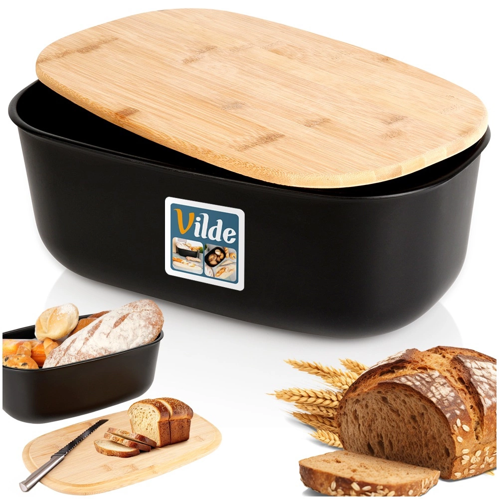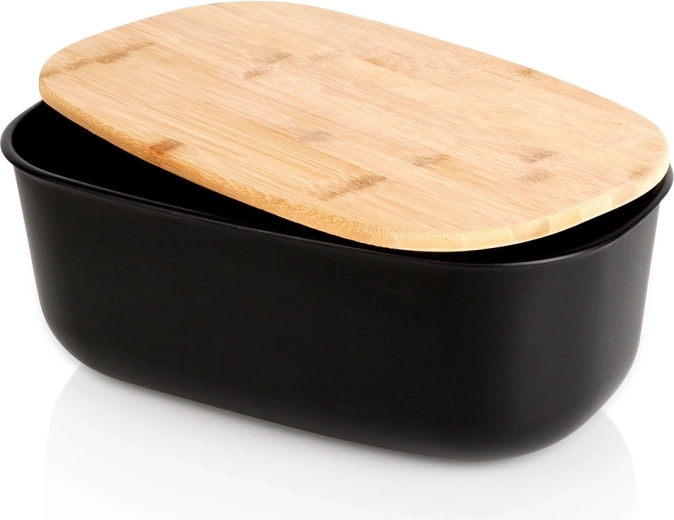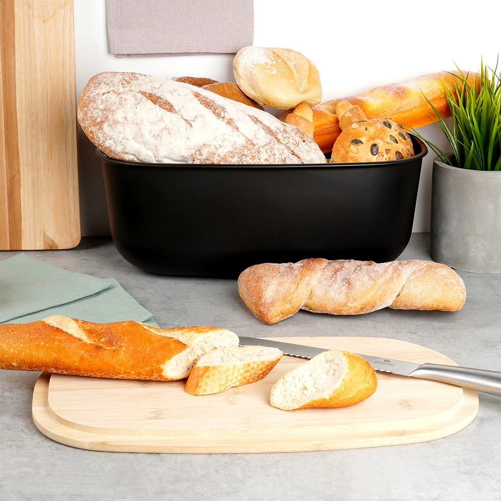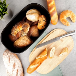 Den rummelige brødbeholder med målene 39 × 23,5 × 15,5 cm giver rigelig plads til brød, rundstykker, boller og sødt bagværk. Den ovale form og matte sorte finish passer perfekt i både moderne og klassiske køkkener, mens bambuslåget tilfører et naturligt islæt.