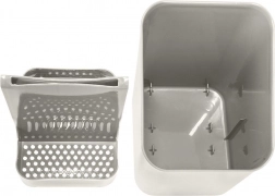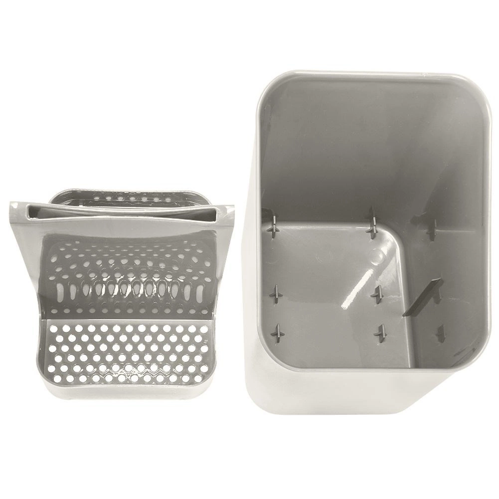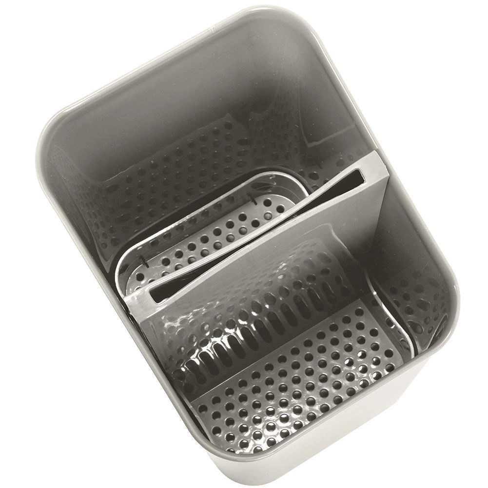 Hold orden ved vasken og på køkkenbordet. Denne bestik-drypbakke i kvalitetsplast i moderne grå farve kombinerer elegant udseende med maksimal funktionalitet. Den udtagelige indsats skaber to adskilte sektioner, og den perforerede bund giver vandet mulighed for at løbe fra, så bestikket ikke står i fugt.