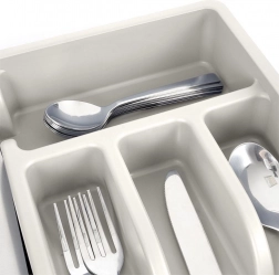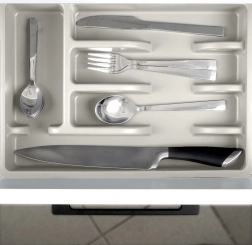 Tre sektioner til bestik, et særskilt rum til teskeer og et langt rum til køkkenredskaber holder alting pænt og overskueligt på sin plads.