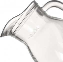 Praktisk glaskande med en samlet kapacitet på 300 ml og markering 0,25 l for præcis dosering. Fremstillet af holdbart klart glas, med et behageligt håndtag og en formet tud for drypfri hældning. Velegnet til mælk, fløde, vin, vand, juice og saucer, tåler opvaskemaskine og mikrobølgeovn. Maksimal drikketemperatur 60 °C.