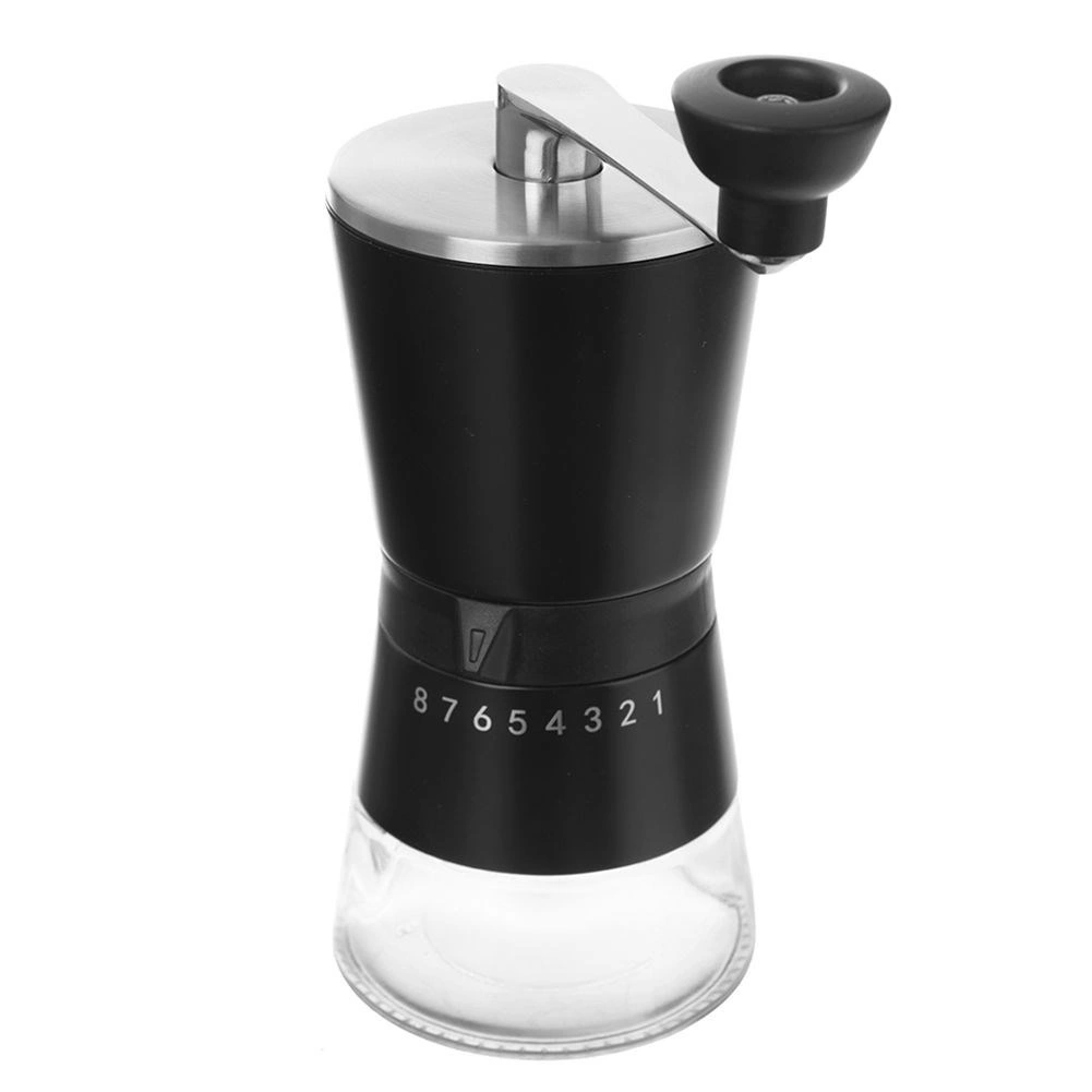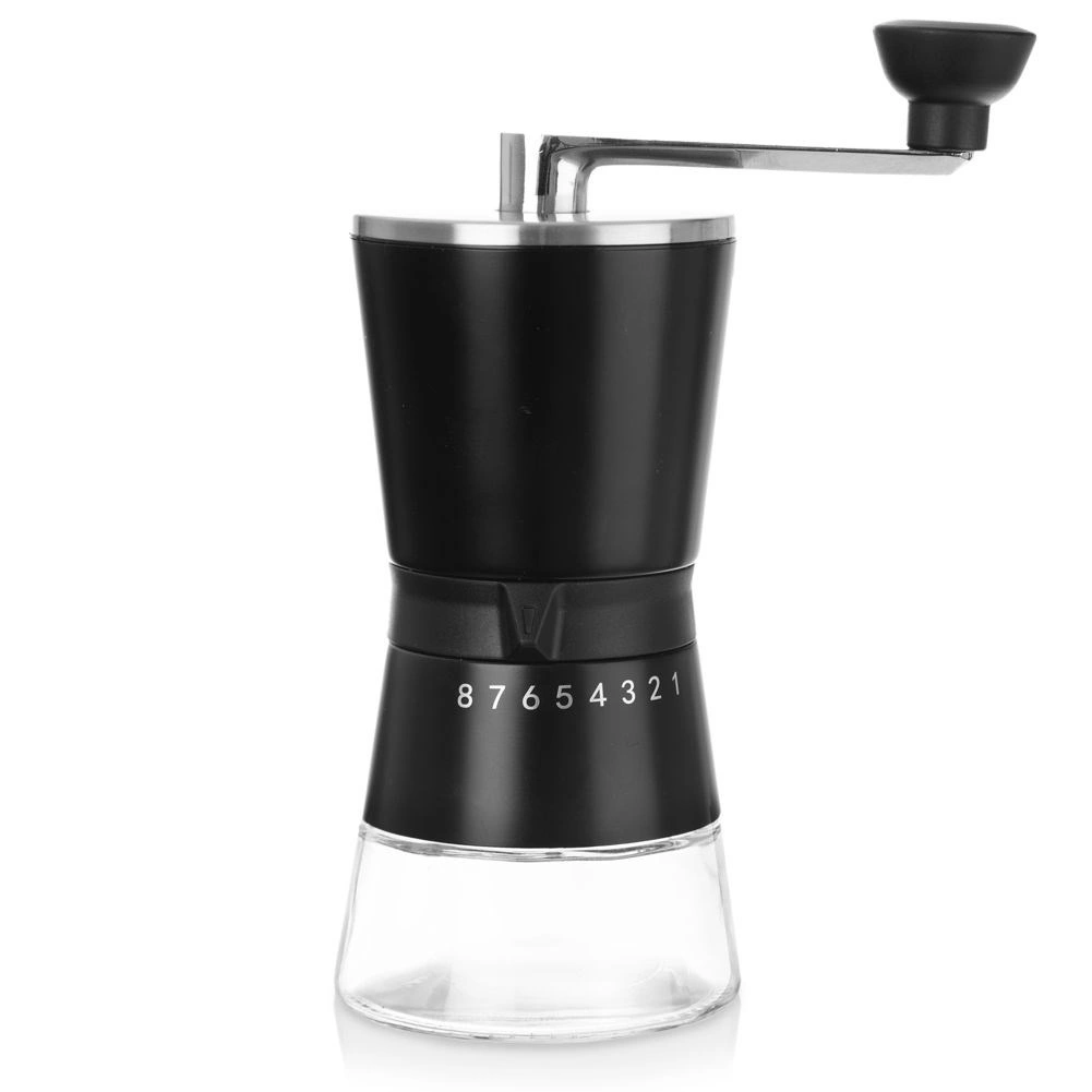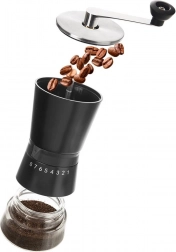 Korpus i rustfrit stål med mat, skridsikker overflade ligger robust og behageligt i hånden. Den nederste gennemsigtige glasbeholder gør det muligt at overvåge mængden af malet kaffe. Svingarmen i metal med komfortgreb sikrer jævn formaling uden anstrengelse.