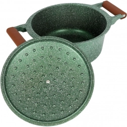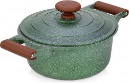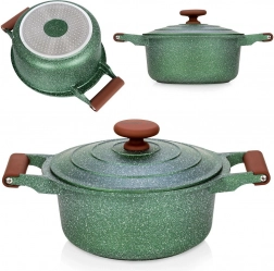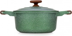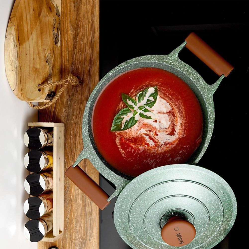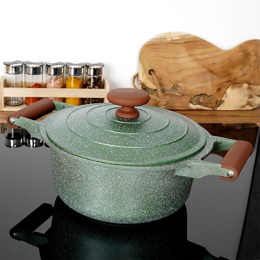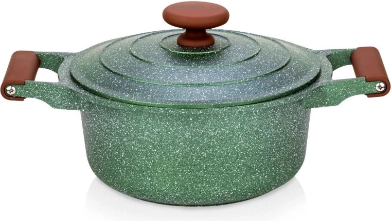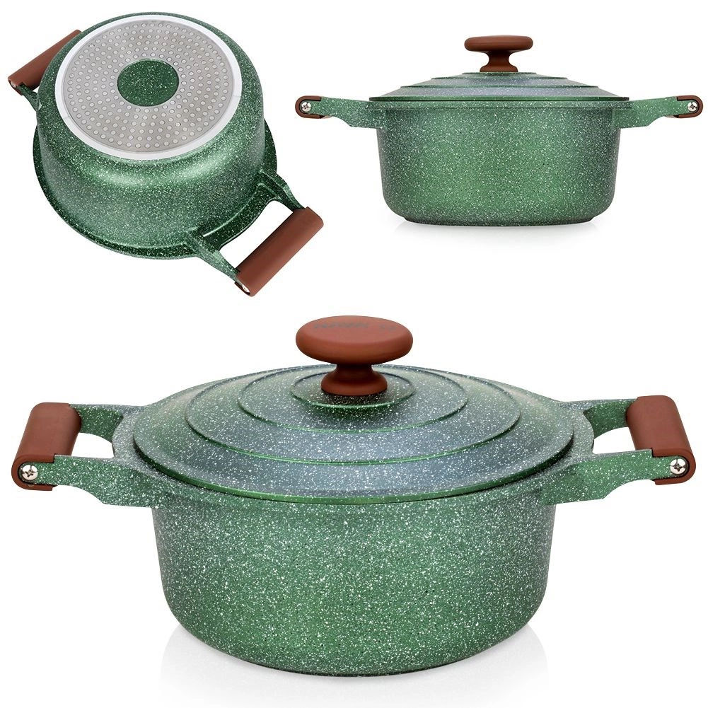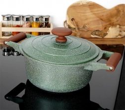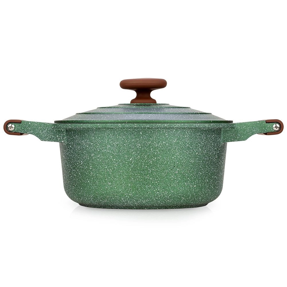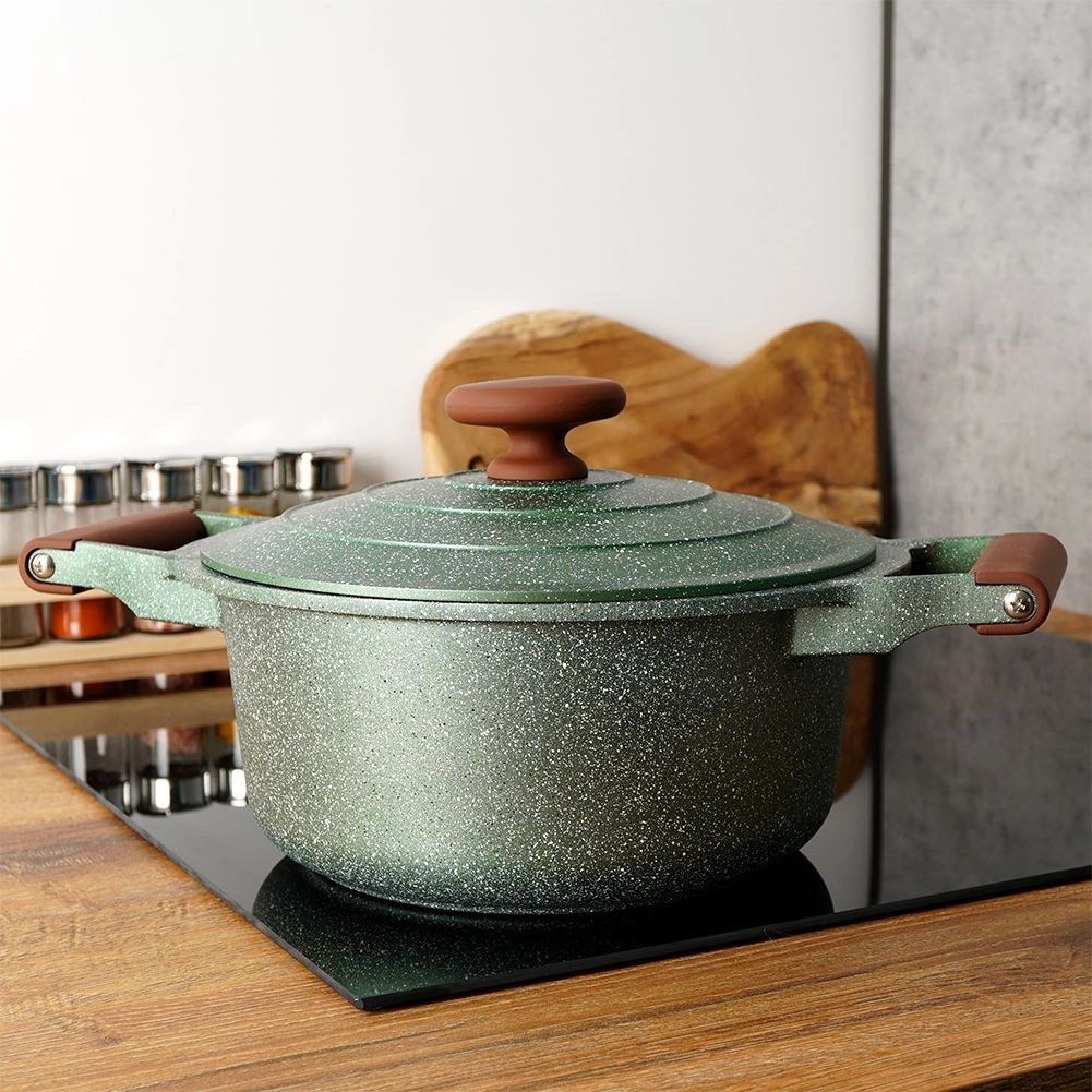 Oplev praktisk anvendelighed og elegance i ét. Denne mørkegrønne granitgryde med brune soft touch-greb imponerer med sit tidløse udseende og fremragende ydeevne. Den femlags granitbelægning sikrer nonstick, varmebestandighed og nem rengøring, så madlavningen bliver hurtig, sund og med minimalt fedt.