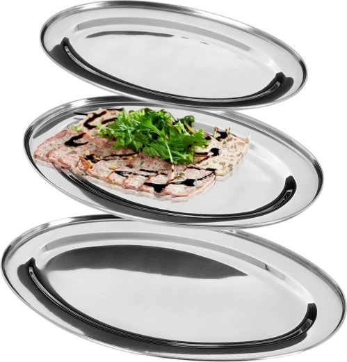Sæt med tre ovale serveringsfade i kvalitets rustfrit stål i en alsidig sølvfarve. Fadene har en spejlpoleret overflade, som er let at rengøre og giver bordet et repræsentativt udtryk. Takket være den solide konstruktion vrider de sig ikke og tåler daglig brug.