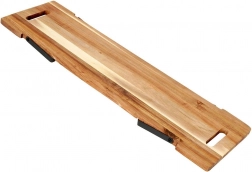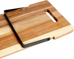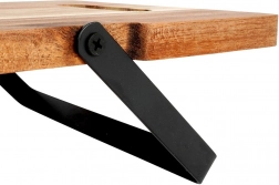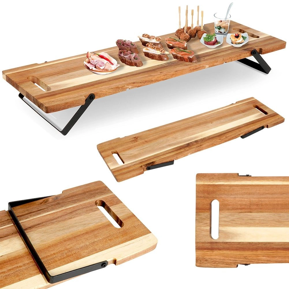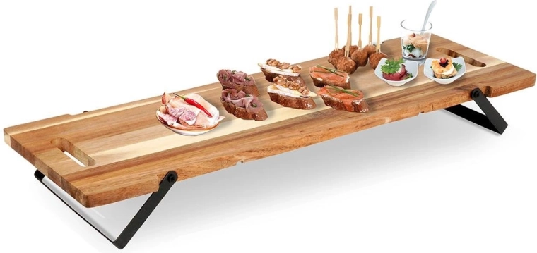 Denne lange serveringsbakke i akacietræ med sammenklappelige metalben løfter præsentationen af dine retter til næste niveau. Integrerede greb på siderne sikrer komfortabel og sikker transport, mens den forhøjede position gør det nemmere at tage for sig og holder bordet overskueligt.