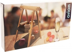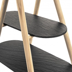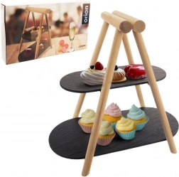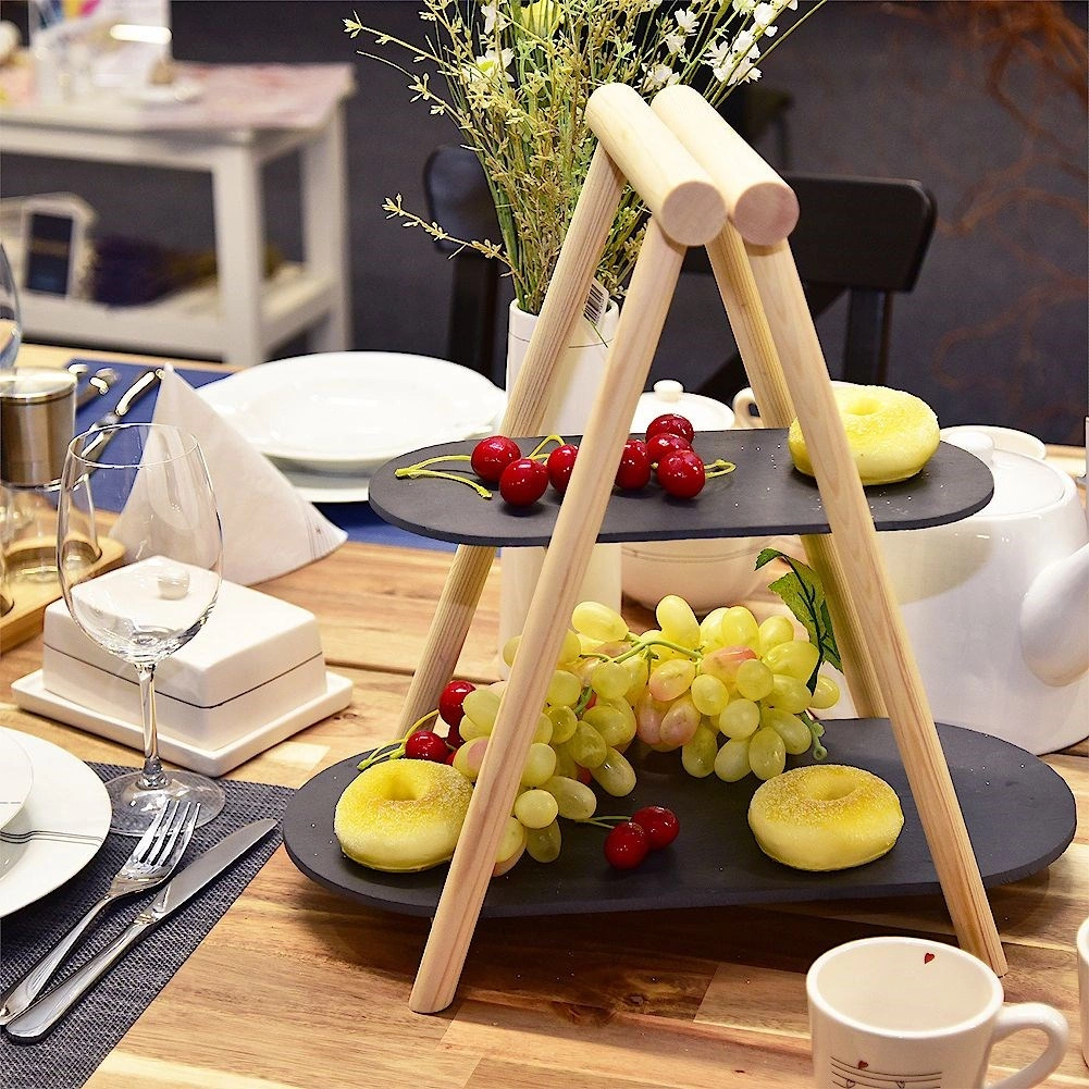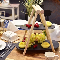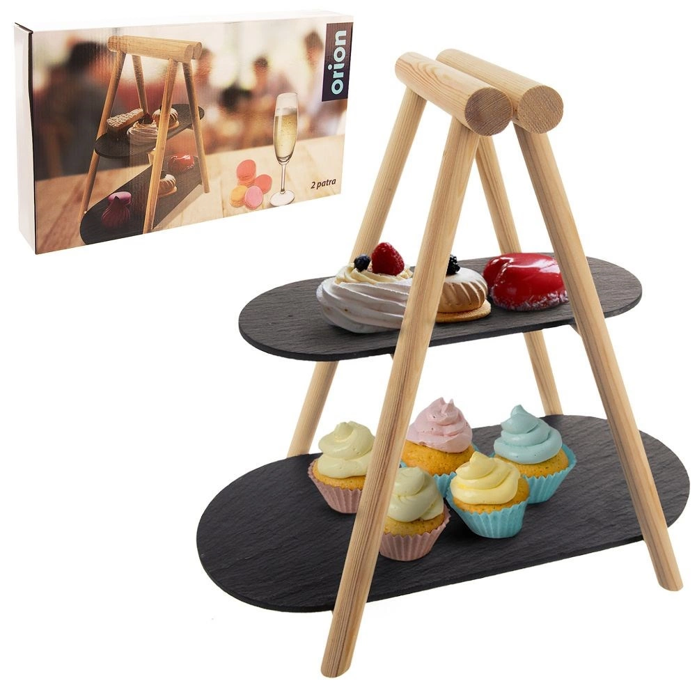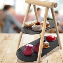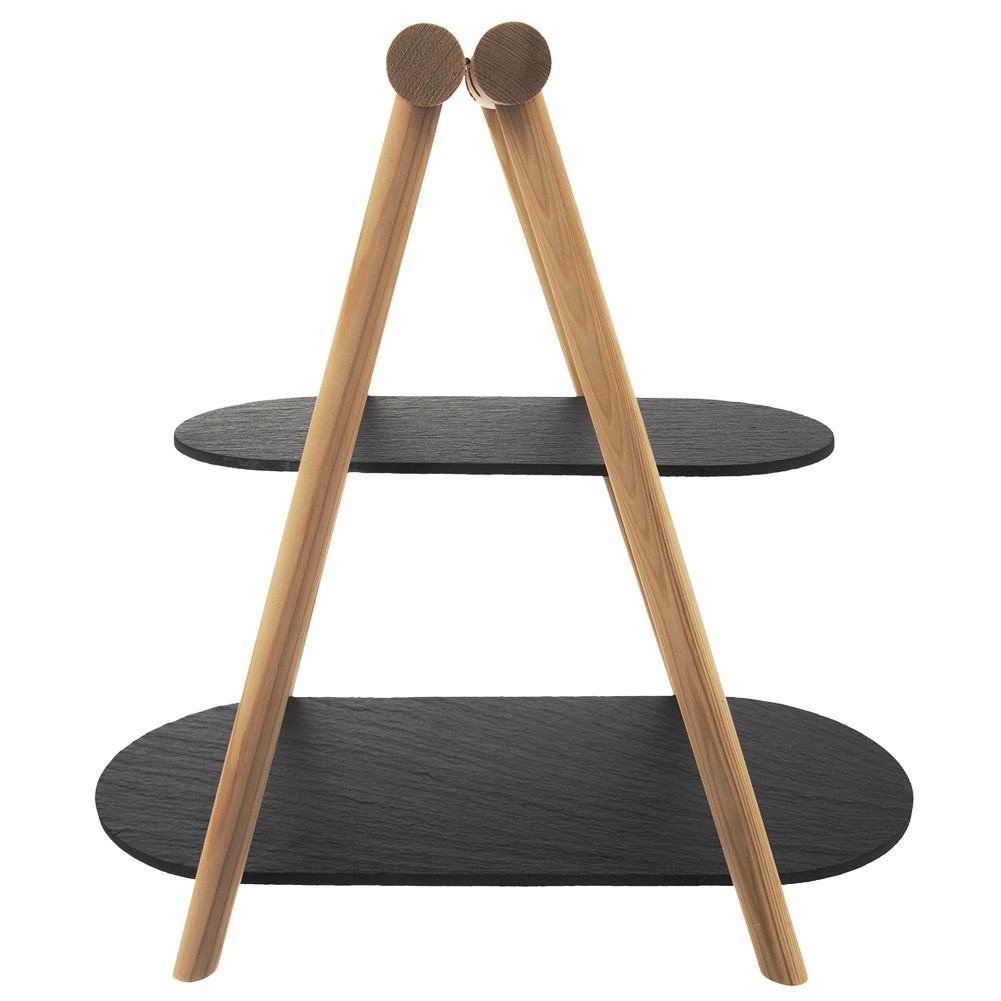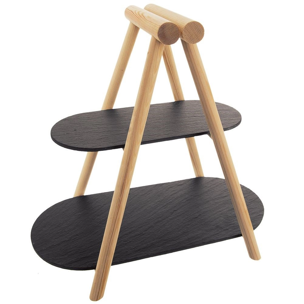 Denne designede to-etagers etagere gør sig flot på ethvert bord. Kombinationen af lyst træ og mørke skiferbakker virker moderne og samtidig tidløs. Takket være de to niveauer sparer du plads og kan præsentere kager, frugt, oste, charcuteri eller canapéer på en effektfuld måde.