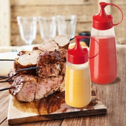 Perfekt til hjemme- og professionelle køkkener: til pizza, hotdogs, sandwiches, salater og også til dekoration – påfør nemt glasur, chokolade eller cremer på kager, muffins og honningkager. De bløde vægge gør det nemt at presse, og skruehalsen giver hurtig genopfyldning. Materialet er robust og let at rengøre, og flasken tåler opvaskemaskine.