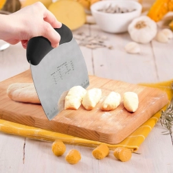 Denne multifunktionelle spatelskraber kombinerer dejskraber, hakkekniv og spatel i ét. Perfekt til arbejde med dej, cremer og fondant og gør det nemt at flytte, portionere og udligne overflader. Takket være den skarpe kant kan du nemt hakke nødder, løg eller grøntsager.
