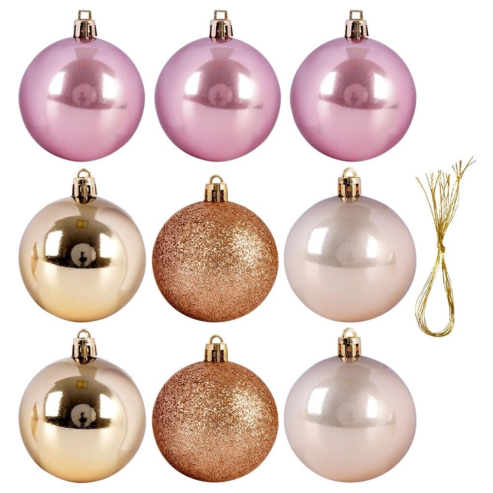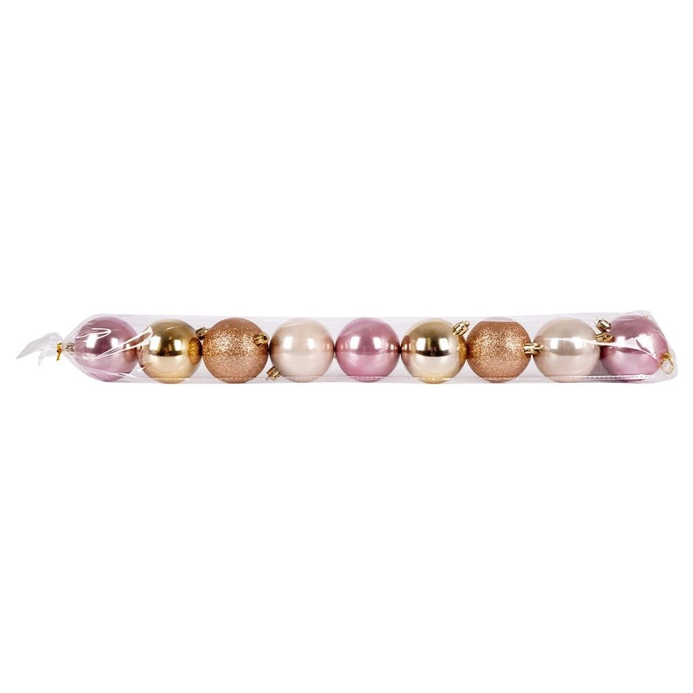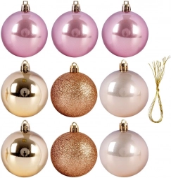 Elegant sæt med ni julekugler i toner af rosa, perlemor og guld, der giver din pynt et luxuriøst skær og et harmonisk udtryk. Kuglerne med en diameter på 6 cm er lavet af splintsikker plast, så de er sikre for både børn og kæledyr. En blanding af blanke, matte og glitrende overflader skaber flotte reflekser, og nem ophængning sikres med de medfølgende gyldne snore.