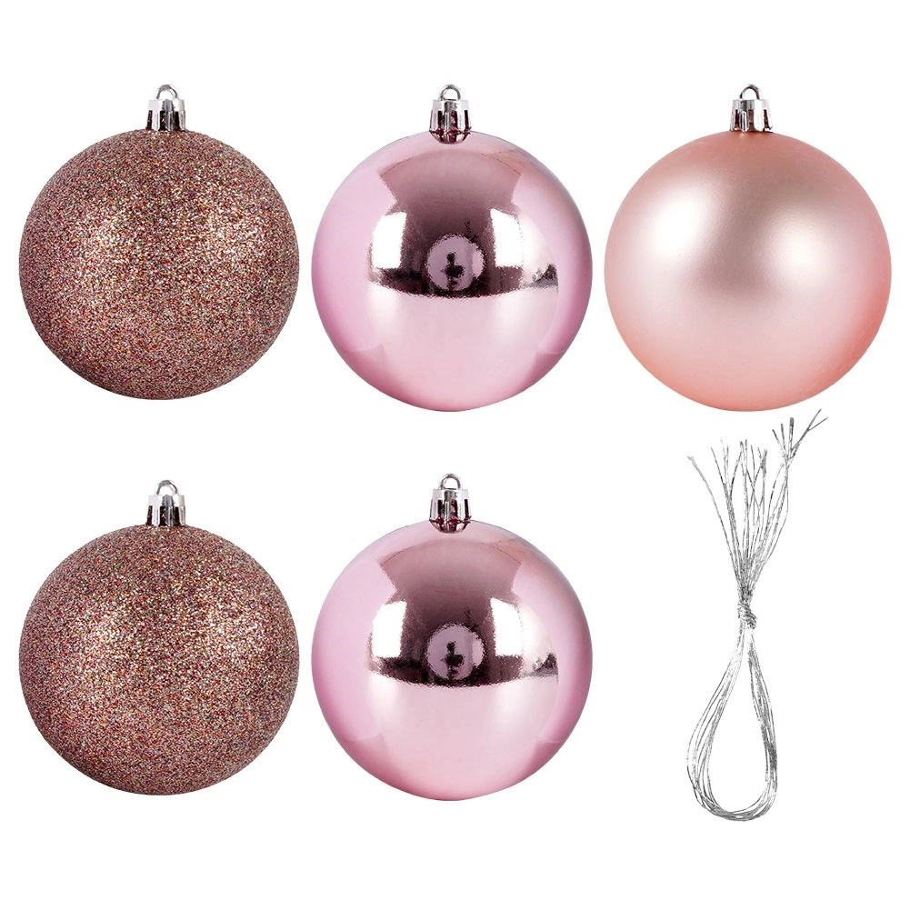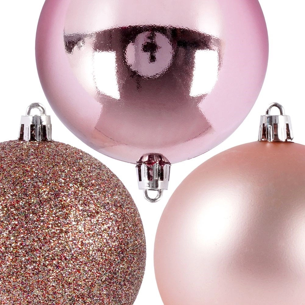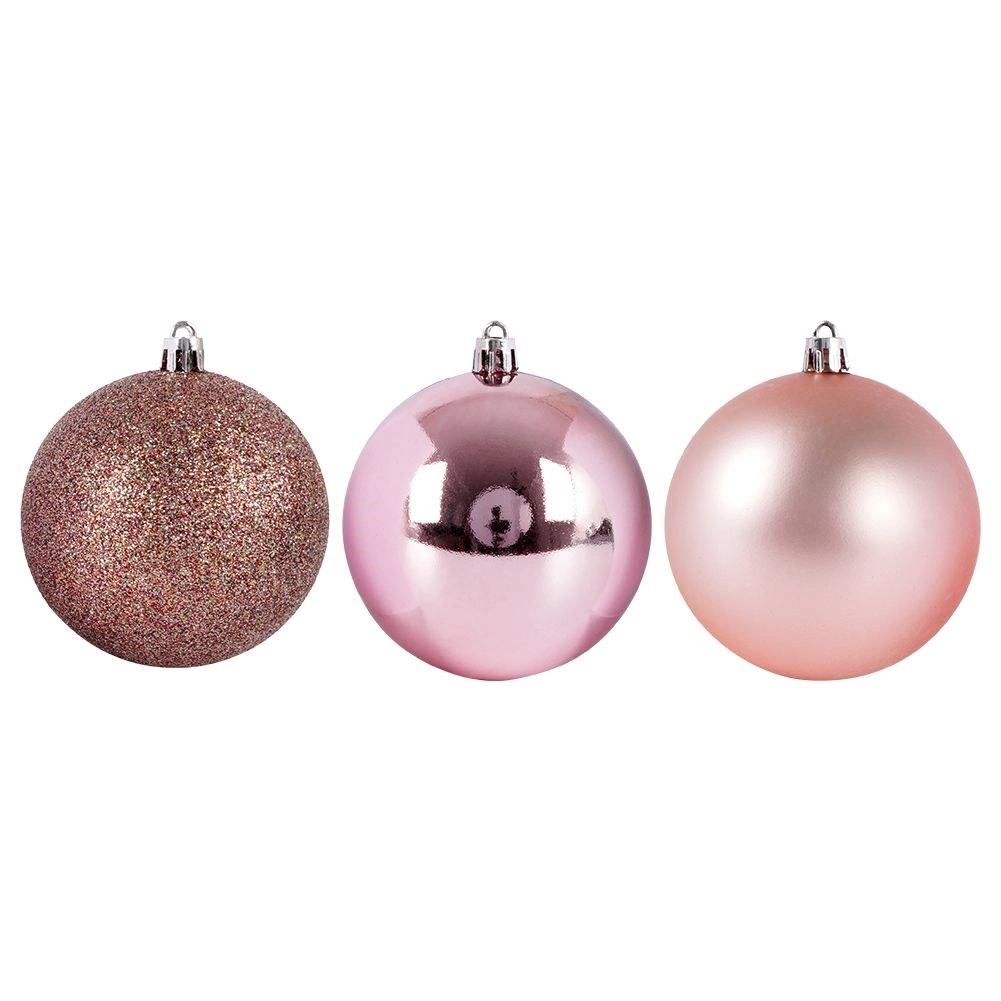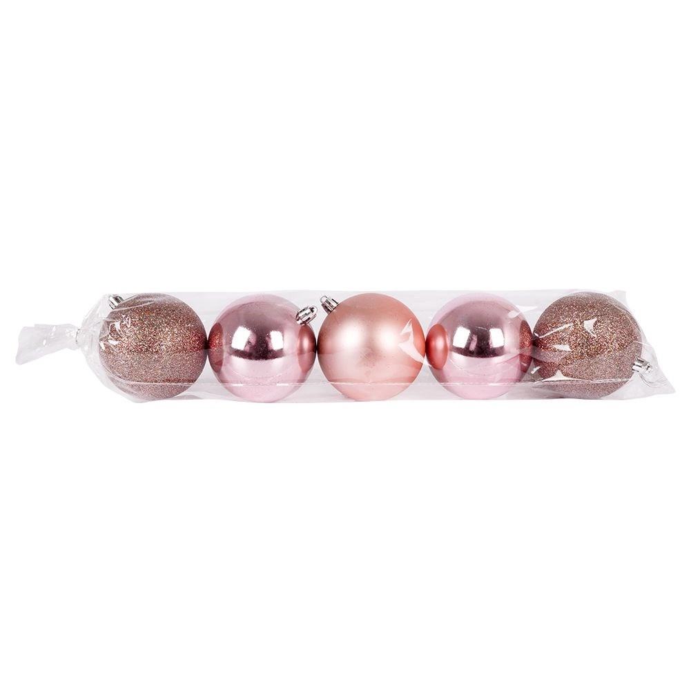 Skab den perfekte festlige stemning med et tidløst sæt på 5 lyserøde kugler. Kombinationen af blank, glitrende og mat finish giver dit træ dybde, kontrast og en subtil glans. Takket være kvalitetsplast er kuglerne lette, robuste og sikre – perfekte til familier med børn og kæledyr.