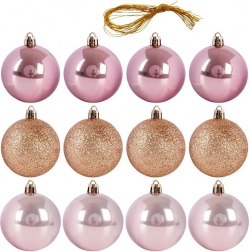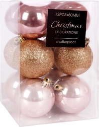 Sættet indeholder 12 kugler med en diameter på 6 cm i tre overfladestile for en livlig visuel effekt: 4× blank, 4× glitter, 4× mat. Kuglerne har metalhætter med øje, og i pakken finder du også snore til nem ophængning. Alt er pænt pakket i en gennemsigtig æske – også ideel som julegave.