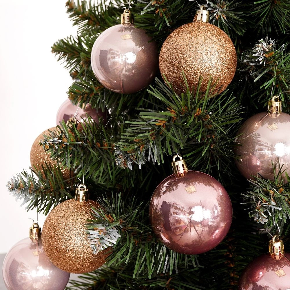 Blank, glitter og mat i rosa og rose gold nuancer skaber et harmonisk og elegant udtryk på juletræet.