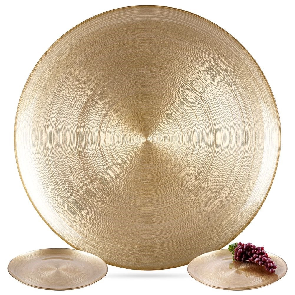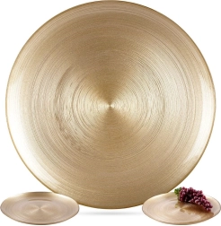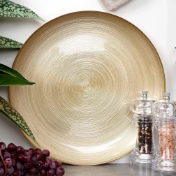 Elegant flad tallerken med en diameter på 32,5 cm i luksuriøs gylden farve, ideel til både hverdag og festlige lejligheder. Fremstillet af kvalitetsglas med en stilfuld mat underside med fine striber, og tilbyder alsidig anvendelse til morgenmad, frokost, desserter eller som et serveringsfad til forretter. Takket være den glatte overflade er den let at rengøre og komplementerer enhver klassisk såvel som moderne borddækning.
