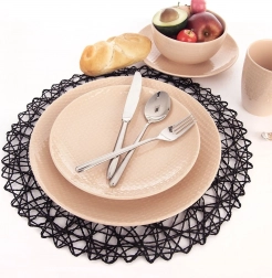 Elegant borddekoration i form af et rundt papirunderlag i sort giver det dækkede bord et moderne og stilrent udtryk. Strukturen, der minder om blonde, virker meget dekorativ og gør sig godt under tallerkener samt glas- og keramiktilbehør.