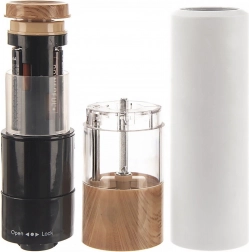 Moderne elektrisk kværn til salt, peber og andre krydderier med en højde på 23 cm, som kombinerer elegant design med praktiske funktioner. Den tilbyder en keramisk kværnemekanisme for præcis kværning, trinfri justering af grovhed, LED-belysning til kontrol af doseringen og nem betjening med én hånd. Den hvide konstruktion med trædekor passer perfekt i ethvert køkken.