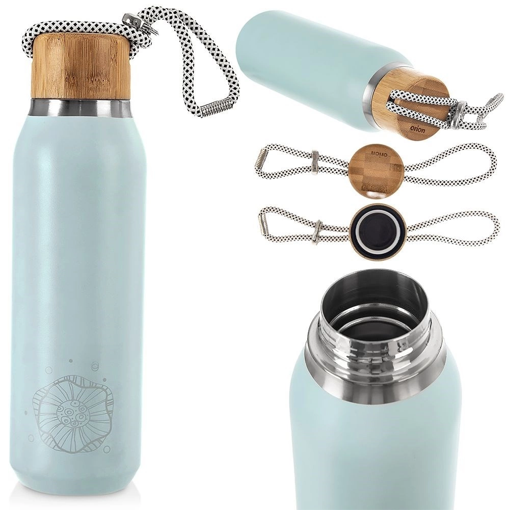 Den brede hals gør påfyldning og rengøring nem, og gør det muligt at tilføje isterninger eller frugtstykker. Det praktiske bambuslåg med strop til nem transport er udstyret med silikonetætning for pålidelig tæthed. Ideel til udflugter, arbejde, skole og sport.