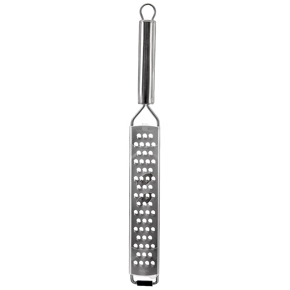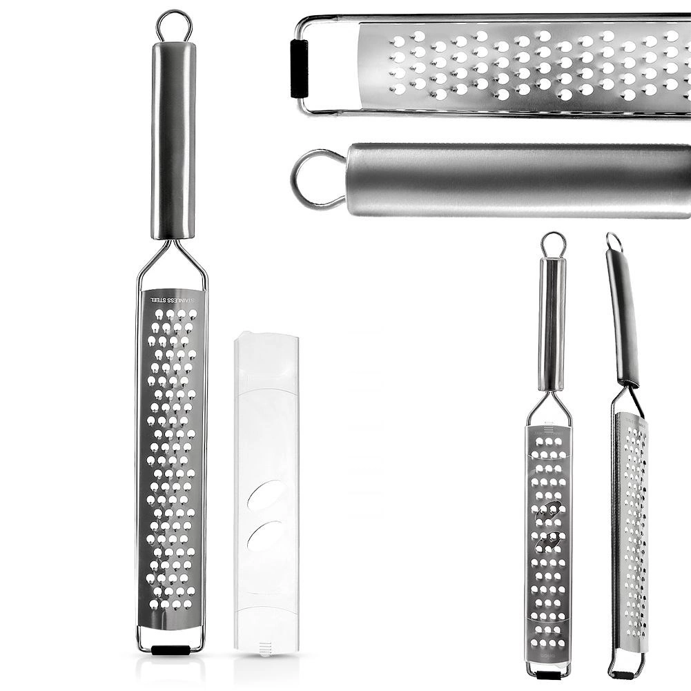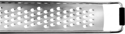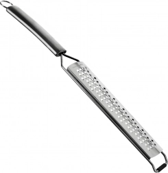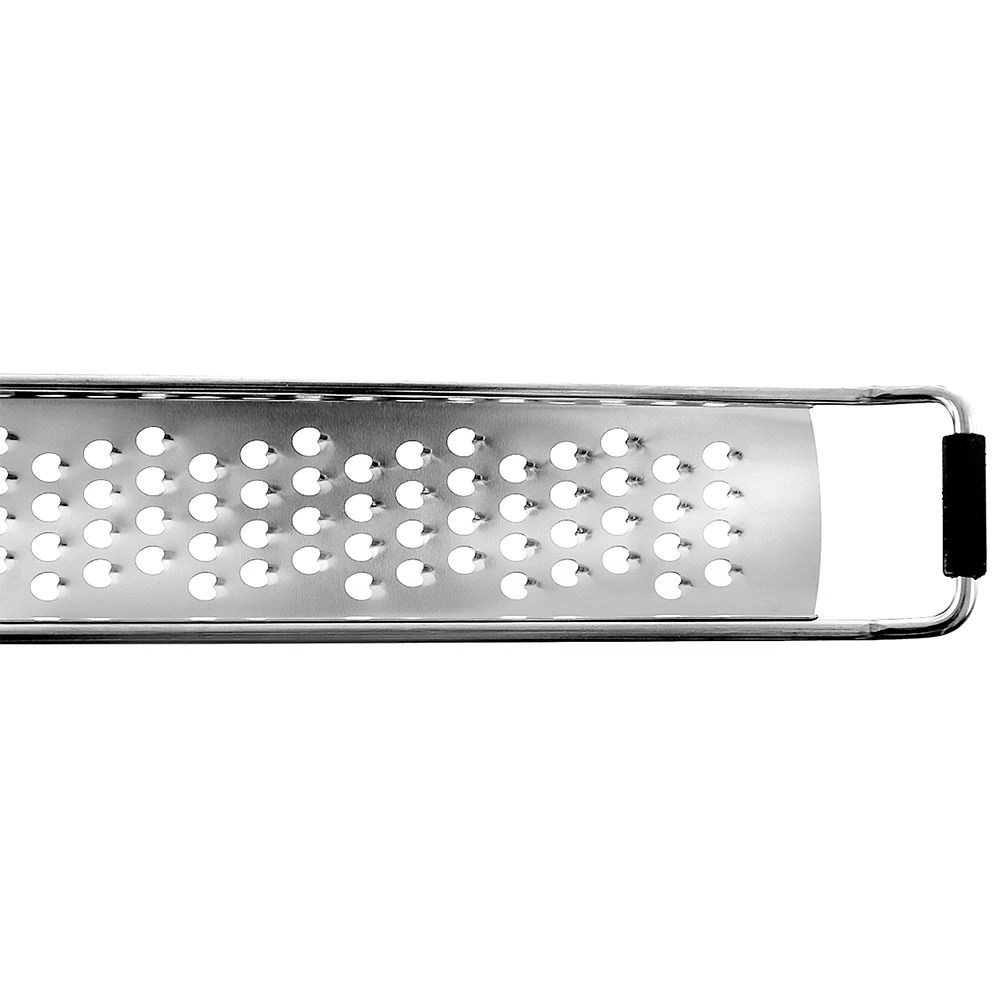 Praktisk fladt rivejern i rustfrit stål med en længde på 38 cm og en bredde på 4 cm til hurtig og jævn rivning. Takket være de skarpe huller kan du nemt rive grøntsager, hårde oste, hvidløg, nødder og citrusskal. Det har et langt håndtag med øje til ophæng, en skridsikker endekappe for sikker brug på køkkengrej og et beskyttelsesetui til sikker opbevaring. Tåler opvaskemaskine.