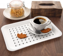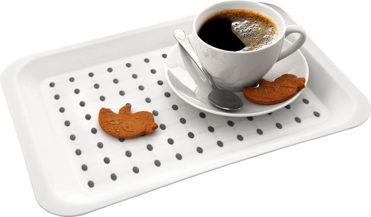 Bakken er perfekt til daglig brug og til at betjene gæster ved festlige lejligheder. Den er let og nem at rengøre og holder til langvarig brug takket være den høje kvalitet. Den alsidige størrelse 33 × 23 cm er ideel til at bære drikkevarer, desserter eller morgenmad på sengen.