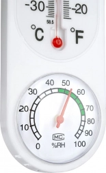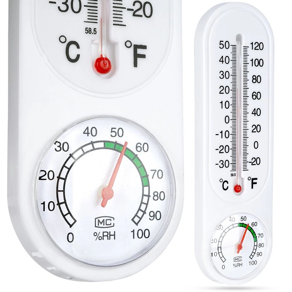 Dette kombinerede termometer og hygrometer giver dig overblik over omgivelsestemperaturen og relativ luftfugtighed i realtid. Den vertikale væskesøjle viser temperatur i °C og °F, mens den nederste runde skive viser fugt i intervallet 0–100 % RH med komfortzone for hurtig orientering.