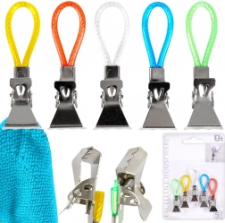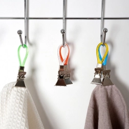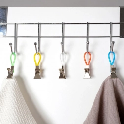 Oplev en enkel måde at holde håndklæder og viskestykker lige ved hånden og pænt ophængt. Metalklemmer med farvede løkker gør det hurtigt at hænge dem på en krog, stang eller knage, og takket være de takkede kæber sidder de fast selv på glattere tekstiler. De forskellige farver på løkkerne gør det nemt at skelne mellem familiens håndklæder.