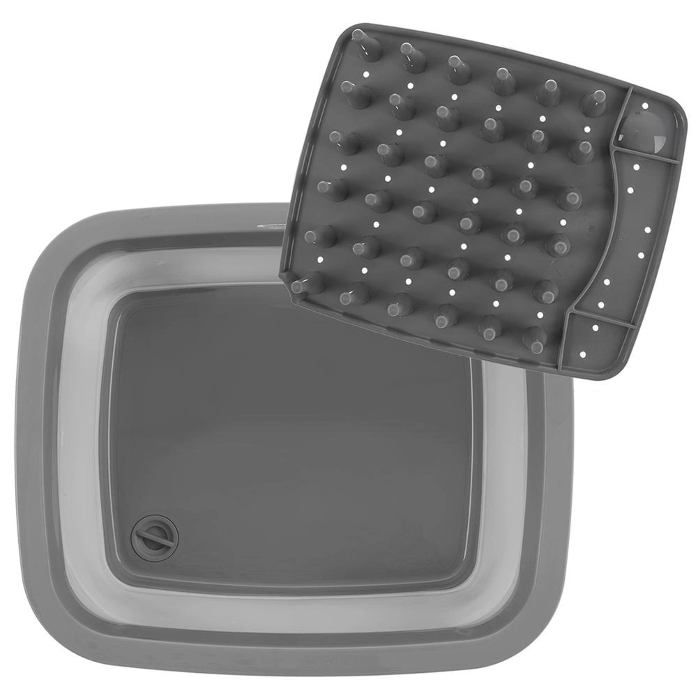 Dette praktiske opvaskestativ til service udmærker sig ved sit sammenklappelige design, så du efter brug nemt kan folde det fladt og opbevare det selv i et lille skab. Takket være det integrerede afløb med prop og den fordelende rende kan du styre vandafledningen og dermed beskytte bordpladen mod fugt.